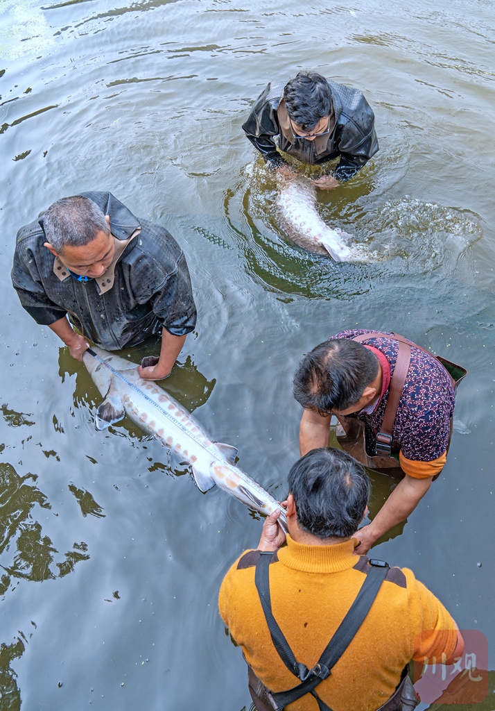 3月22日,科研人员测量亲本长江鲟的体长、体重