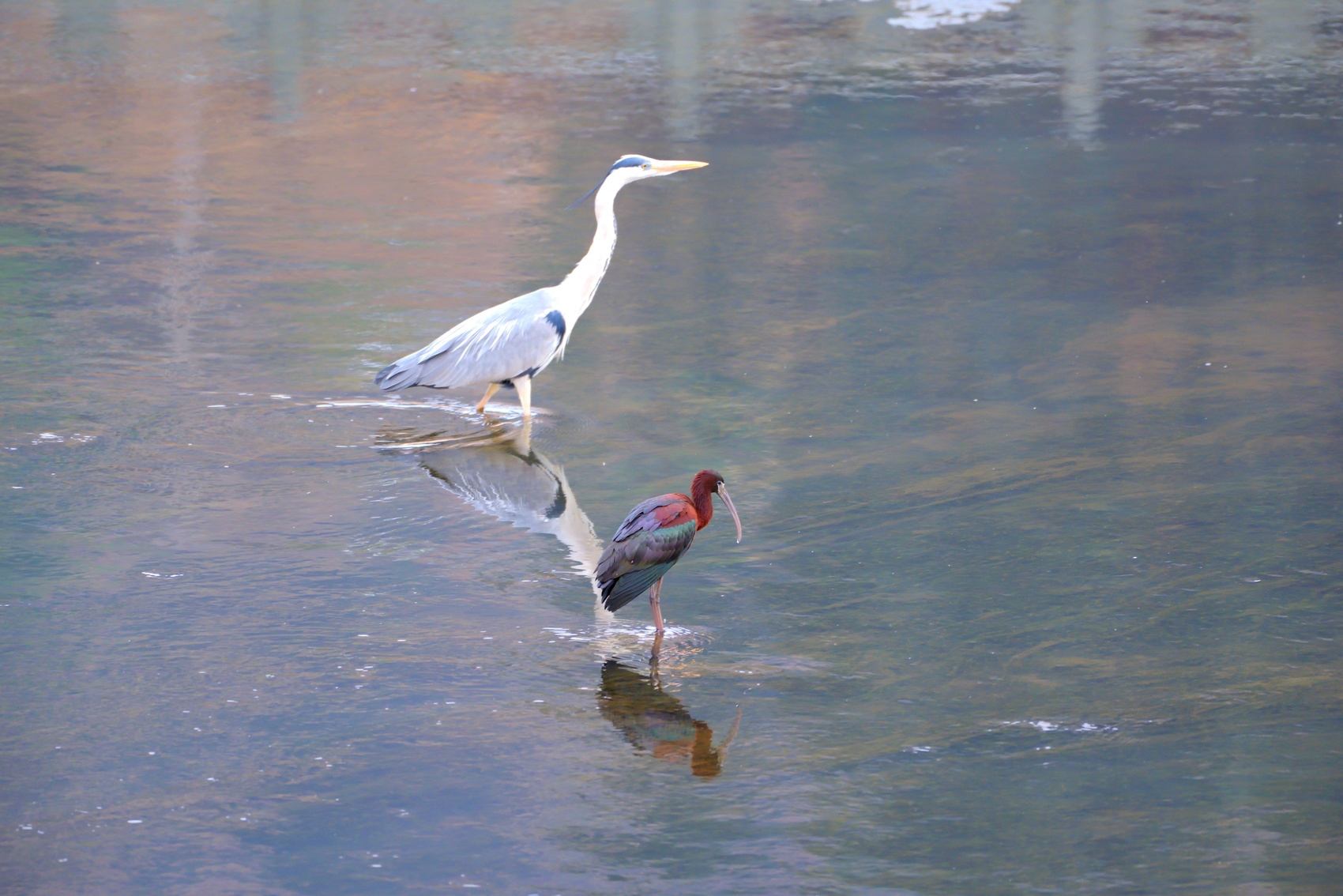 在河滩里,这只彩鹮悠闲地觅食,还和苍鹭等其他野生动物和谐相处。
