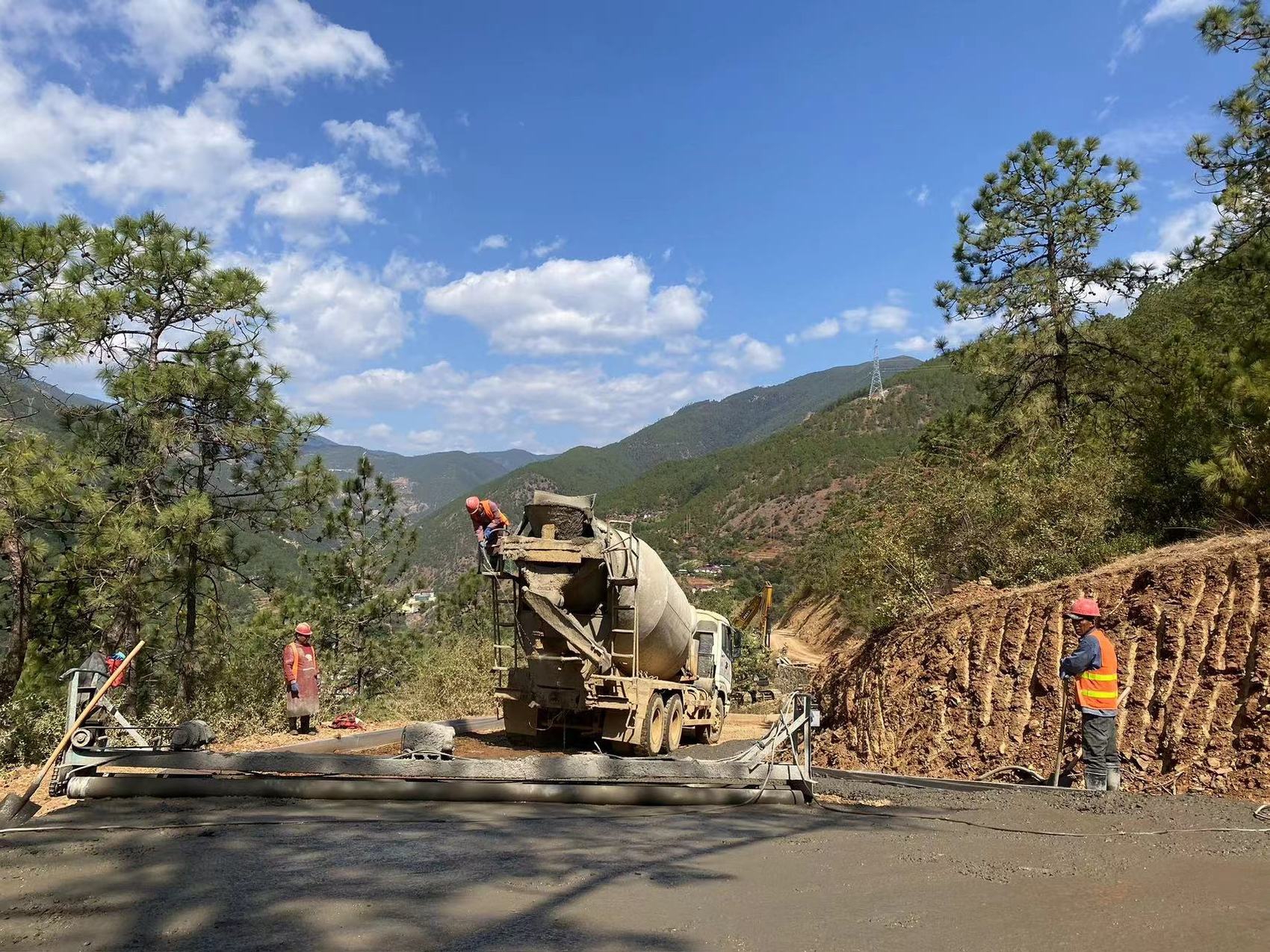 在木里县乔瓦镇锄头湾村红科组产业路建设项目施工现场,随着工程摊铺机的轰鸣,路基水稳层正有序向前延伸,工人们有条不紊地搬运砂石、修路砌墙、平整路面。