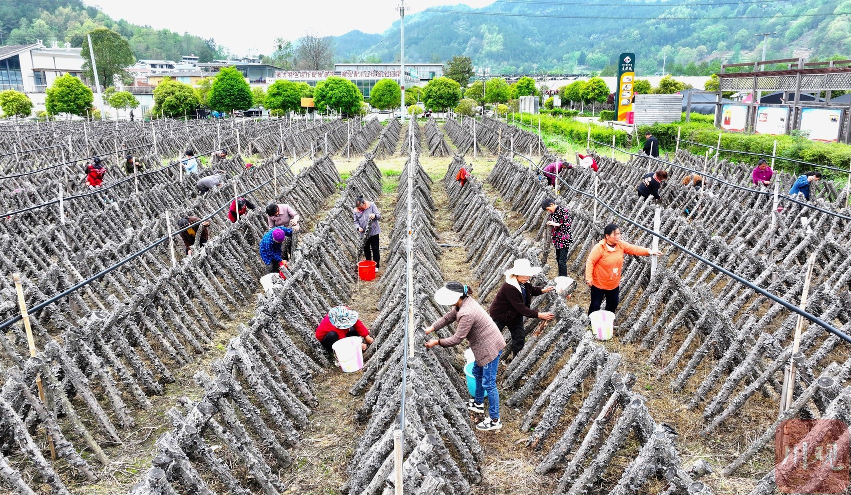 4月12日,青川县木鱼镇现代农业园区段木黑木耳种植基地迎来“头茬”采摘。广元观察 高志农 摄