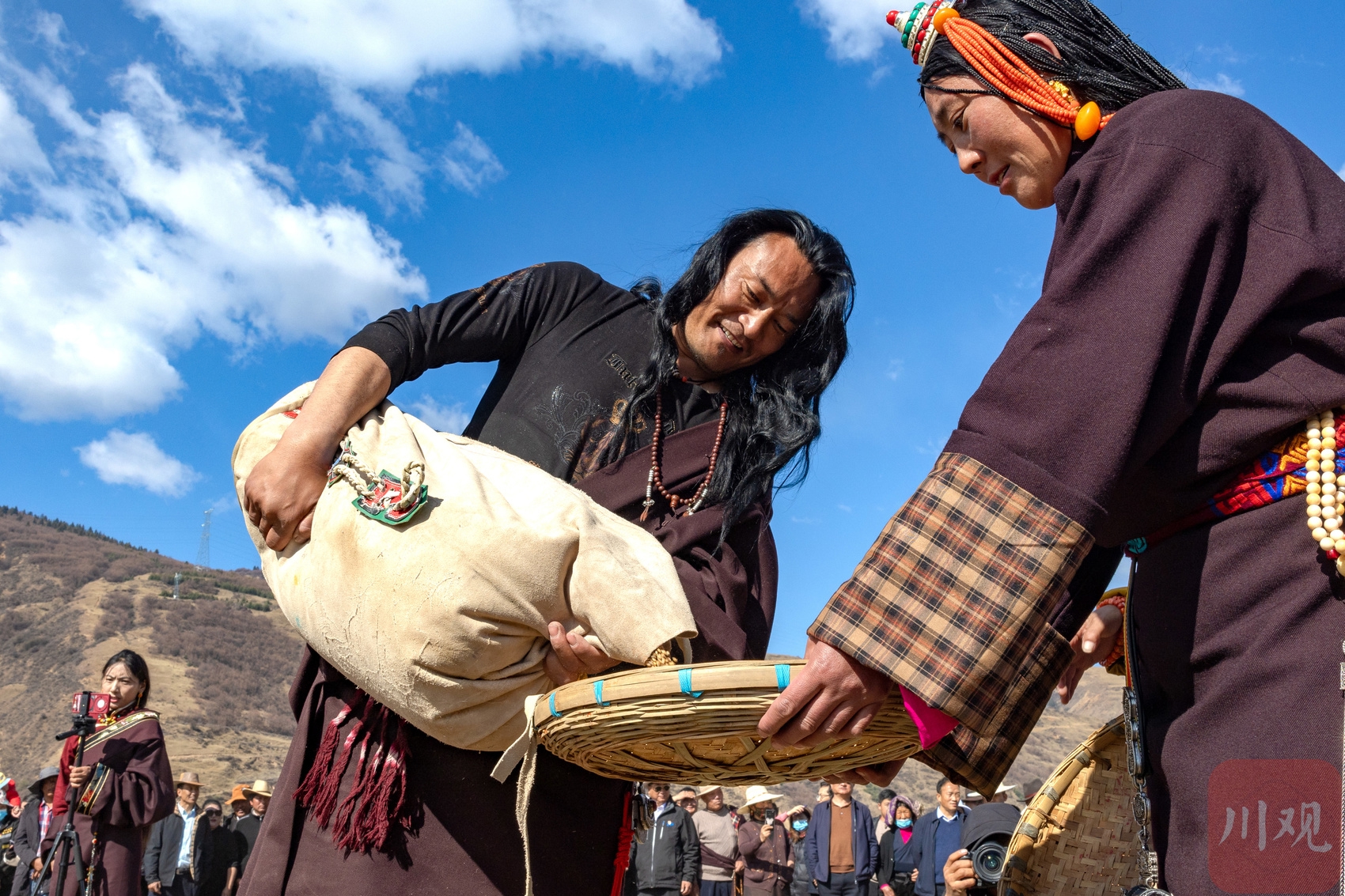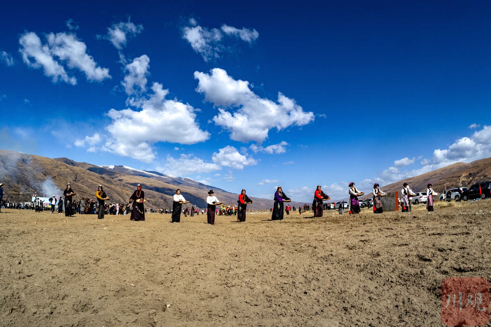 身着盛装的妇女们播撒青稞种子。