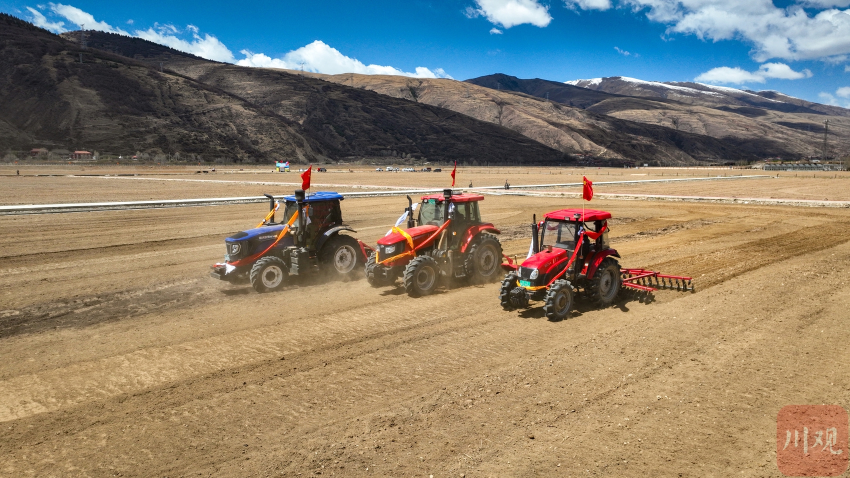 4月13日,四川省甘孜州炉霍县虾拉沱镇的村民们手捧哈达,背着放了各种食品的背篼,驾驶着装扮过的拖拉机,纷纷来到田间地头,共同举行开耕仪式。