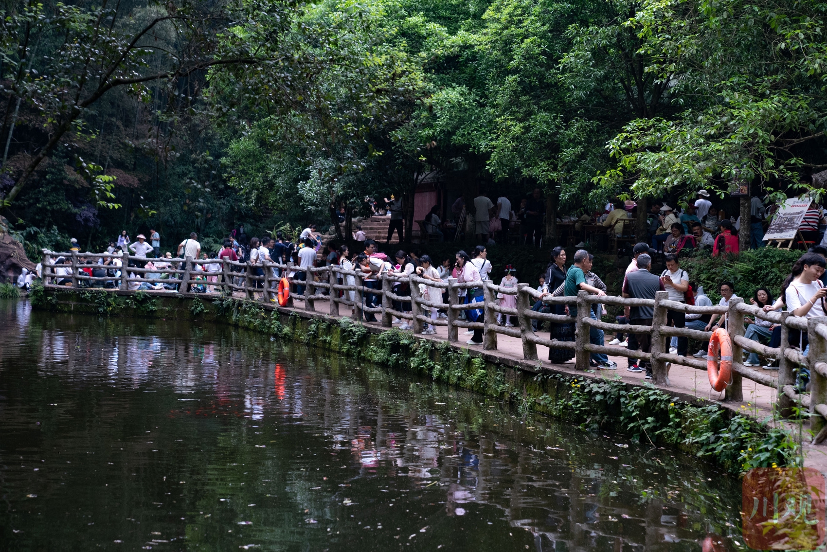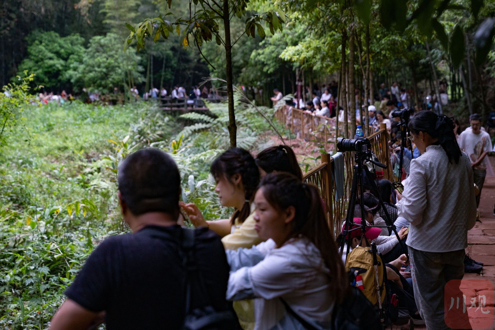 4月14日傍晚,在青神县中岩风景名胜区内萤火虫出没的区域,游客提前“抢占”观赏位置。