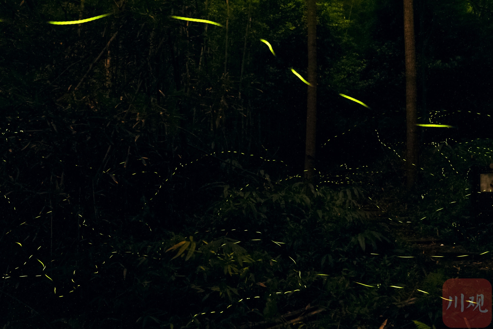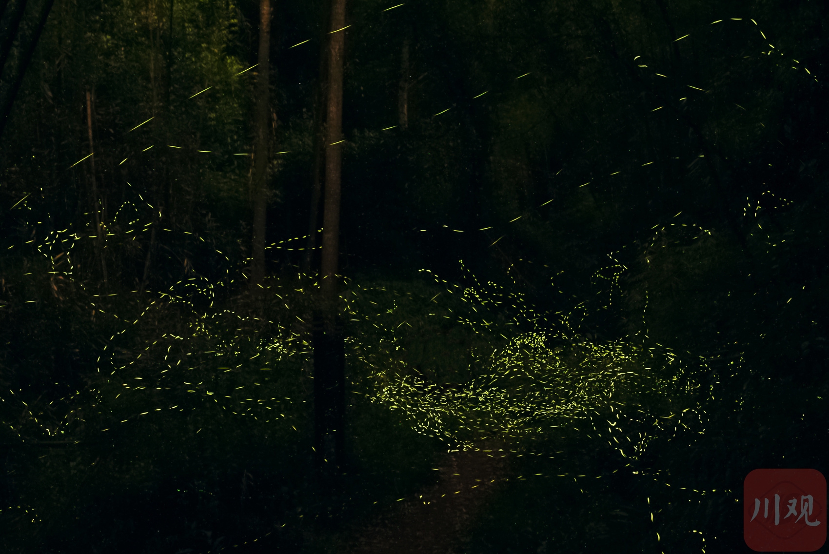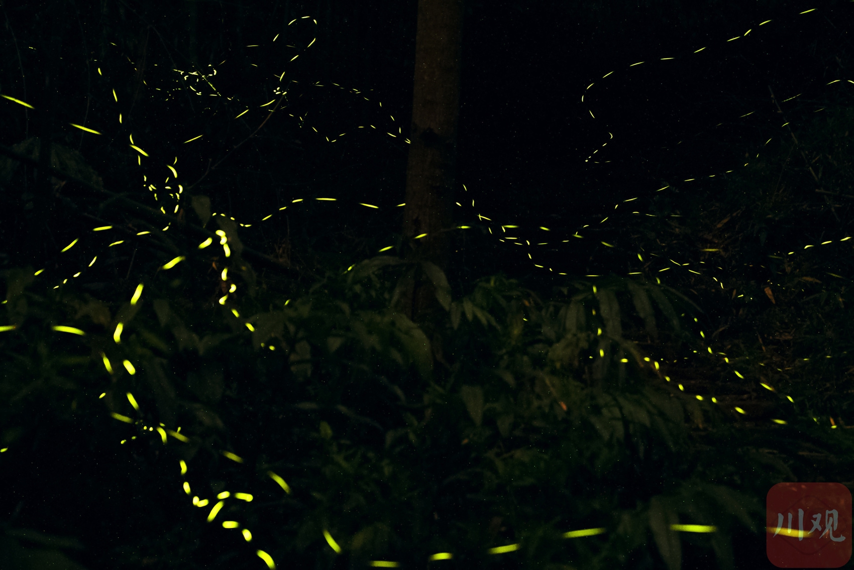 4月14日晚上,在青神县中岩风景名胜区林间飞舞的萤火虫成群结队,闪耀夜空。