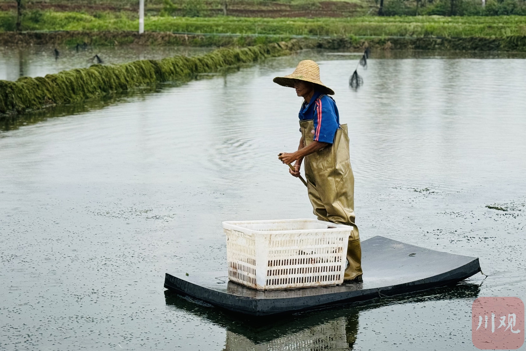 置身田间,可以看到村民们捕捞虾没有使用小船,而是用一块简易的浮板,在水中来去自如。“浮板相较于船来说,更轻便好操作,可以承重300斤,一位村民就可以完成一块田的捕捞工作,如果用船捕捞,得同时要好几个人配合才得行,费时费力。”泸县海牧种养殖专业合作社成员刘雁兵说。