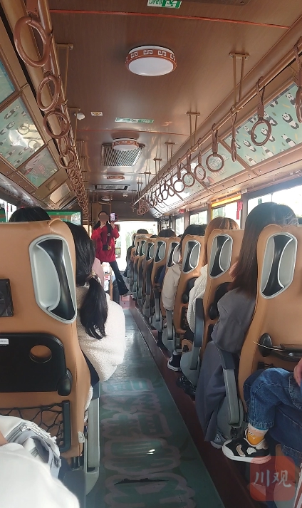 记者注意到,408路公交车车身装点有大熊猫图像,车厢内有软包座椅和水杯座等配置,也设有拉环,用于乘客站立使用,车票依然是2元/人。