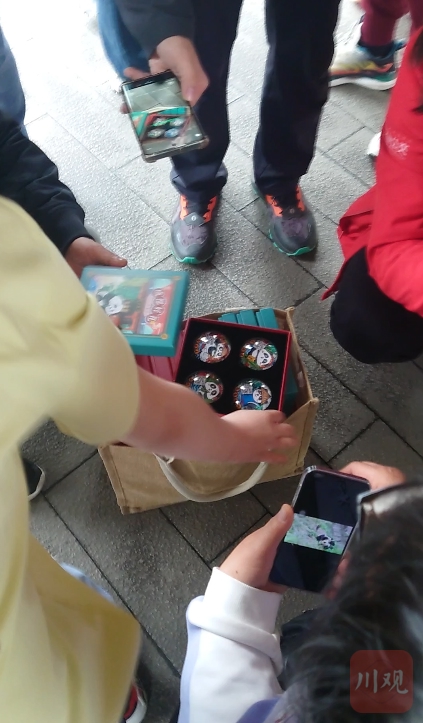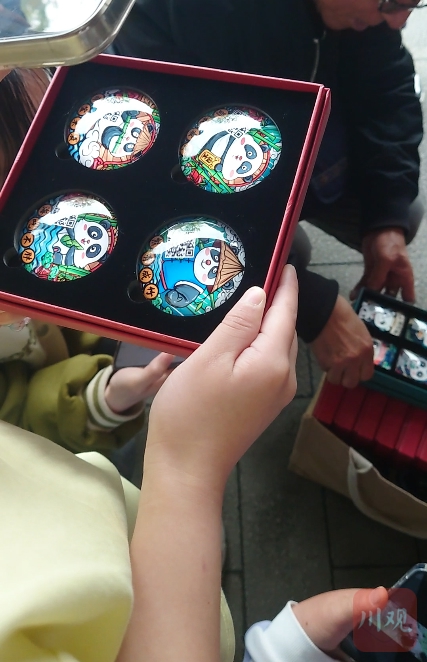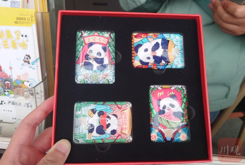 很快,该名工作人员从一旁的布制口袋中取出一盒红色包装的物品,开始向游客推销起旅游纪念品:“这是我们文旅公交推出的定制熊猫冰箱贴,每一只上面都有一个二维码,用手机一扫就能看到基地里的熊猫。内容每三个月更新一次,永久有效。一共两款,一盒4个,单盒售价69元。”