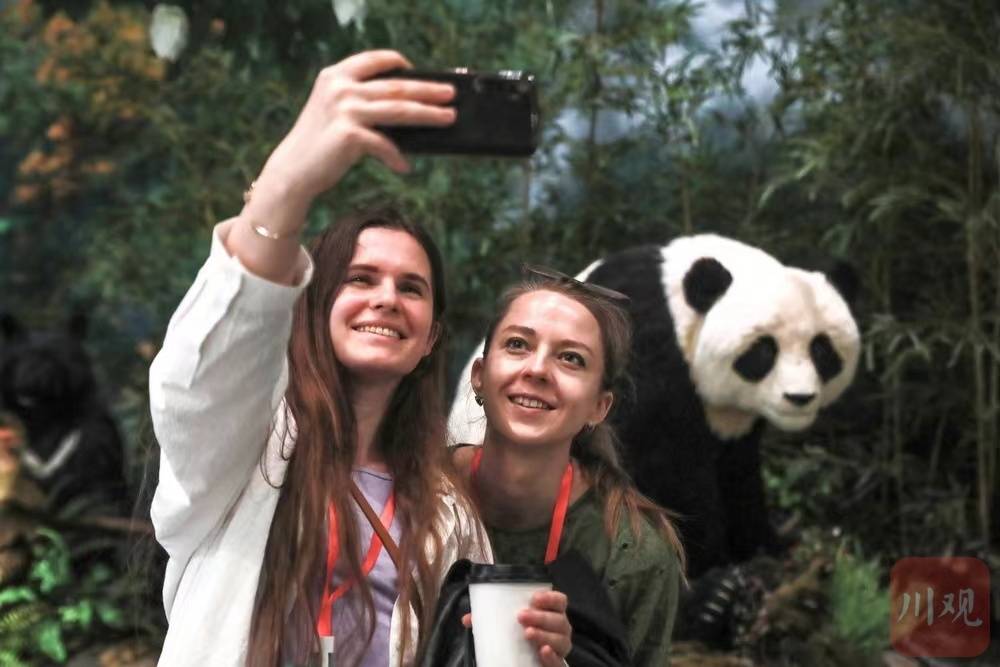 外国青年在大熊猫动物模型前合影 黄刚 摄