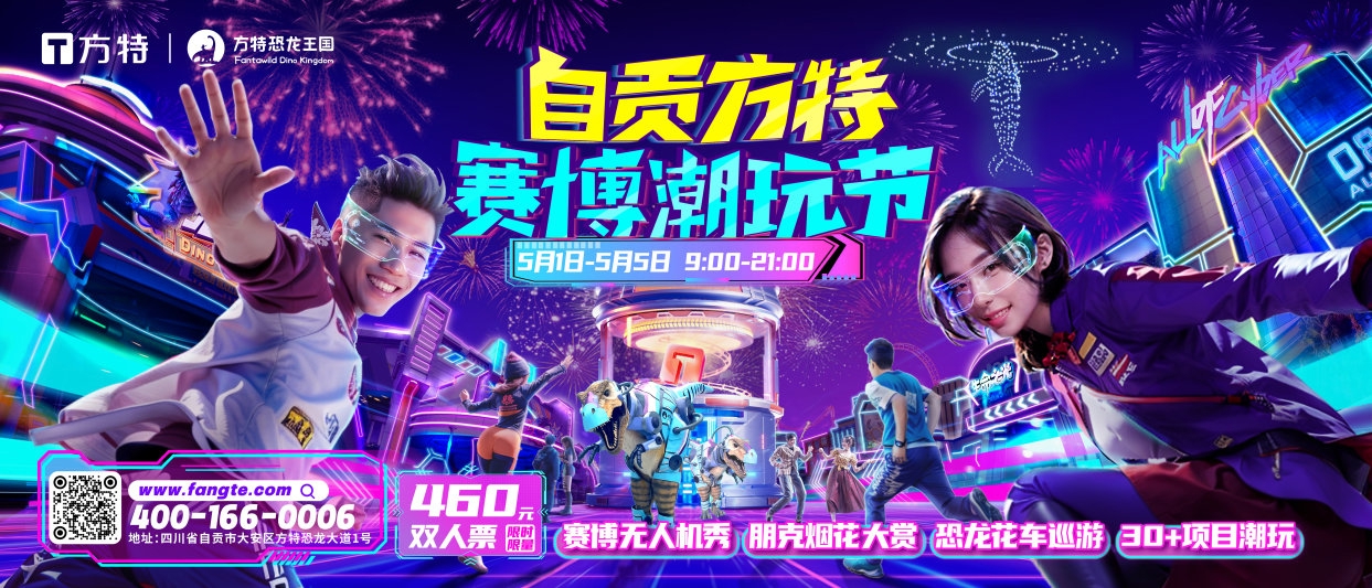 5月1日至5月5日,自贡方特恐龙王国(以下简称“自贡方特”)将开启“方特赛博潮玩节”主题活动,限量推出460元双人票,打造赛博恐龙大巡游、AI驯龙师和潮玩夜场,更有千架无人机和烟花空降自贡方特,带领游客在“白+黑”12小时超长游园体验中畅玩39大主题游乐项目,“解锁”多样玩法。
