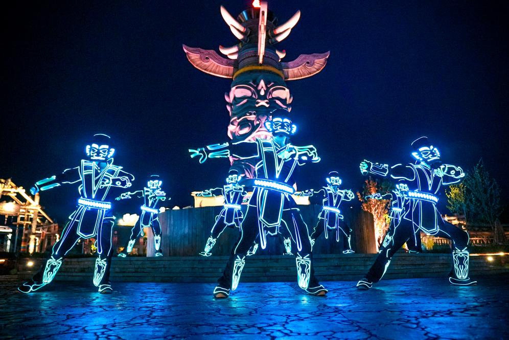 “赛博潮玩盛典”将在夜晚举行。届时,乐队演出、赛博舞蹈和MC狂欢在中央基地舞台轮番上演。“赛博光影秀”千架无人机群排列组合,震撼绘制翼龙飞进穿越门、地球与银河系等3D立体画面,让游客沉浸式体验“空间+科技”的无限魅力。“朋克烟花秀”压轴出场,冷色系烟火与千架无人机相呼应,丰富游客夜间游玩场景。