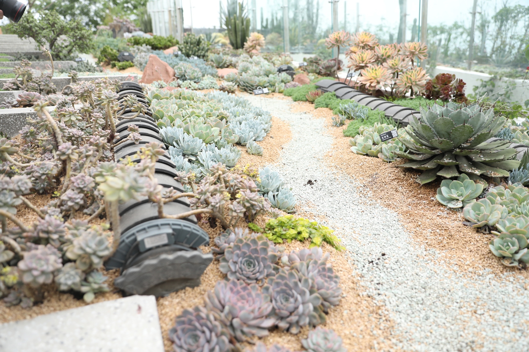为了营造植物生长的理想环境,专业技术人员在原有混凝土屋顶的基础上进行了细致的改造。“我们在底部架设了50毫米厚的透水板,确保水分顺畅渗透,并在每个隔舱四周密布100毫米直径的排水盲管,有效防止积水,再加上350毫米厚的EPS轻质粉碎泡沫板,为植物提供稳定的生长基础;接着覆盖二层粗麻布和二层土工布,以增强土壤的保水性和透气性;最后,在表面铺设了150毫米厚的多肉植物专用颗粒料营养土,为沙生植物和多肉植物提供了充足的养分。”上海建工园林集团绿建公司项目负责人龚明介绍道,完成这些精心准备后,项目部进行了植物的种植工作,并在植物上层覆盖了一层50毫米厚的麦饭石,增添了自然的韵味。