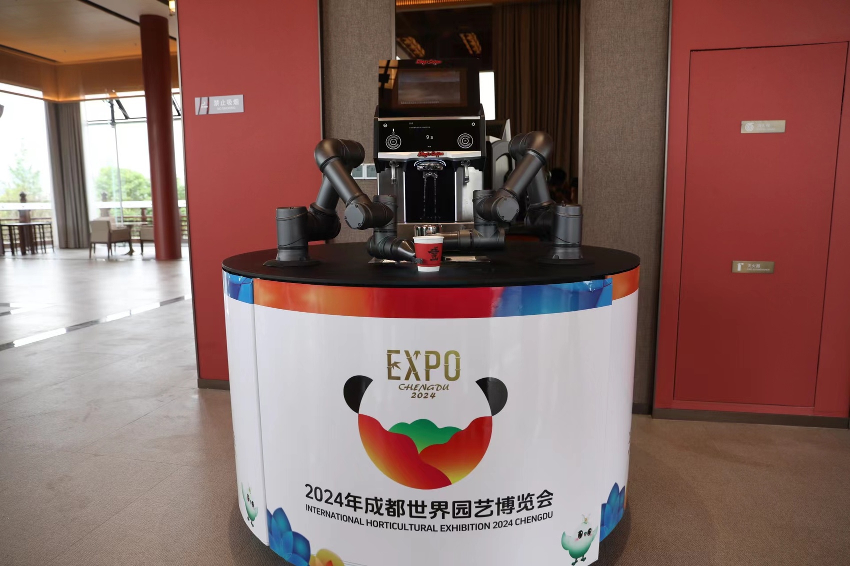 东部新区主会场在配套设施上也充满着科技感。 在锦云楼的壹丁咖啡展位,游客可以品尝到全程由机器人制作出的咖啡。“游客用手机在小程序上一键选择自己喜好的口味并下单后,机器人两只粗壮的‘手臂’就会灵巧利落地运转,不到一分钟,一杯热腾腾的咖啡就可以送到手中。”展位负责人介绍道。