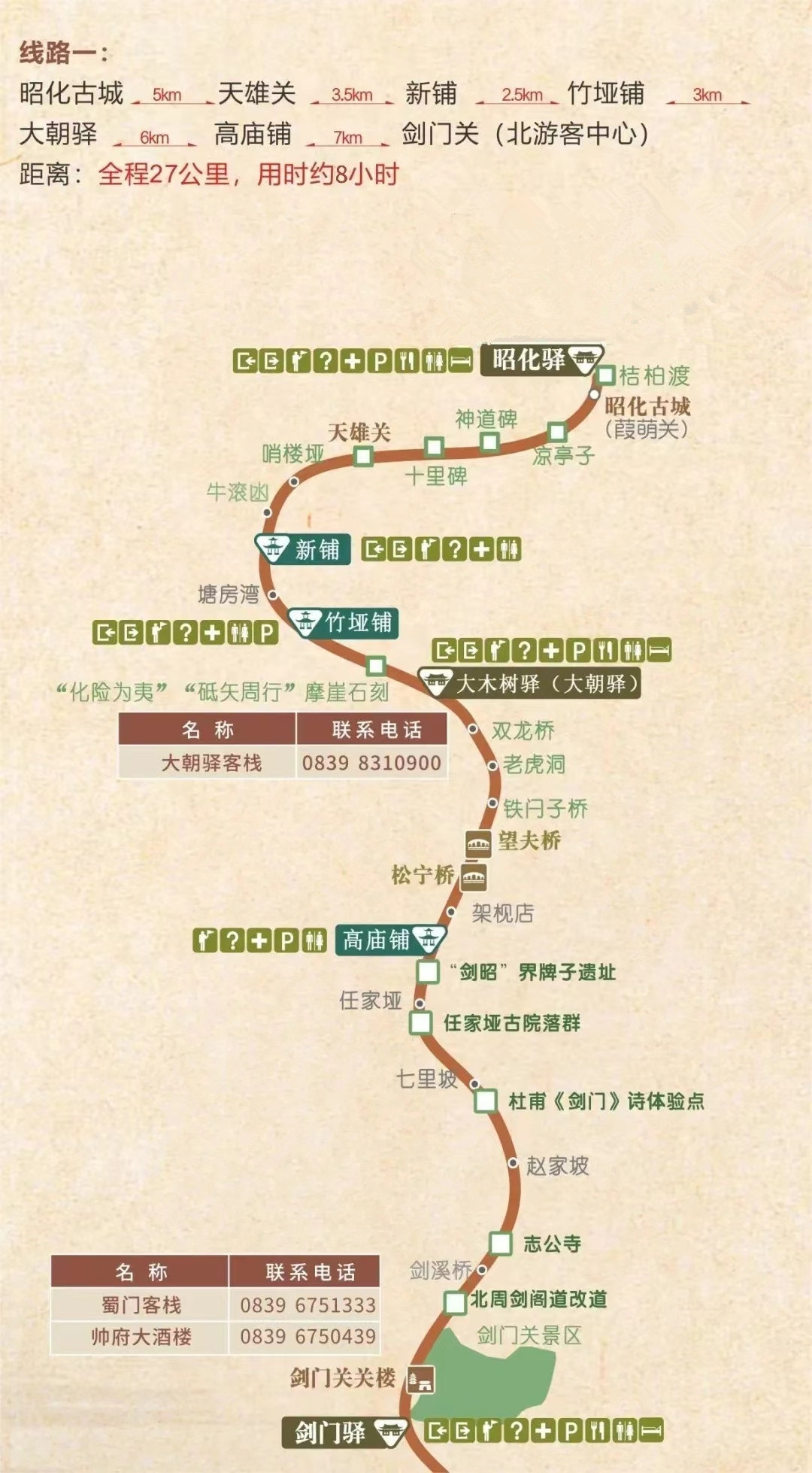 昭化古城—(5km)—天雄关—(3.5km)—新铺—(2.5km)—竹垭铺—(3km)—大朝驿—(6km)—高庙铺—(7km)—剑门关(北游客中心)