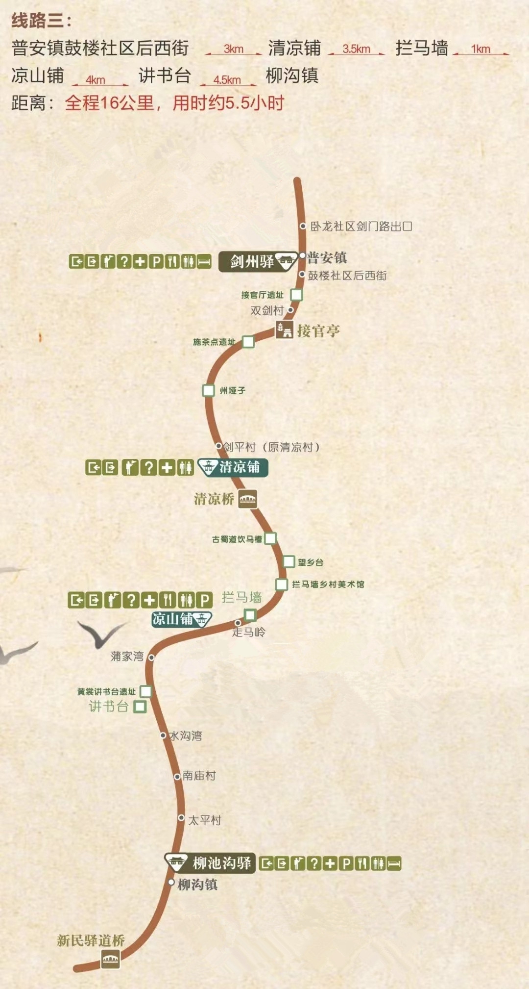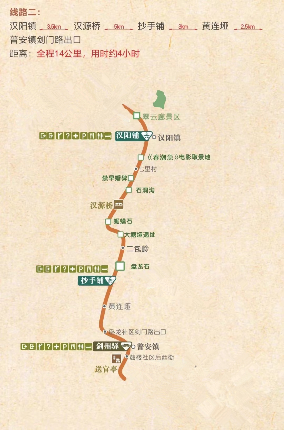 从高庙铺到望夫桥,全长2.2公里,全程约40至50分钟,沿途可欣赏参天古柏,感受幽幽古道;从普安镇到柳沟镇,全长16公里,全程约5.5小时,沿途可游古城、看古关……