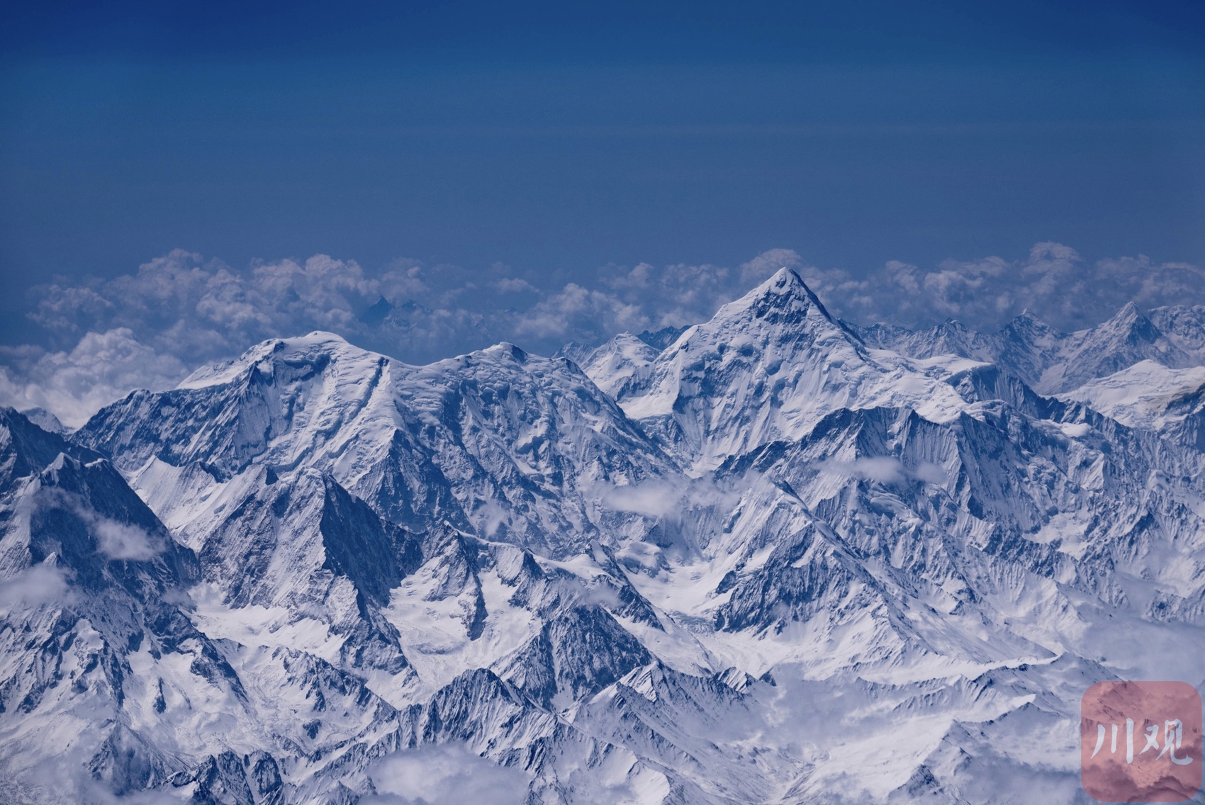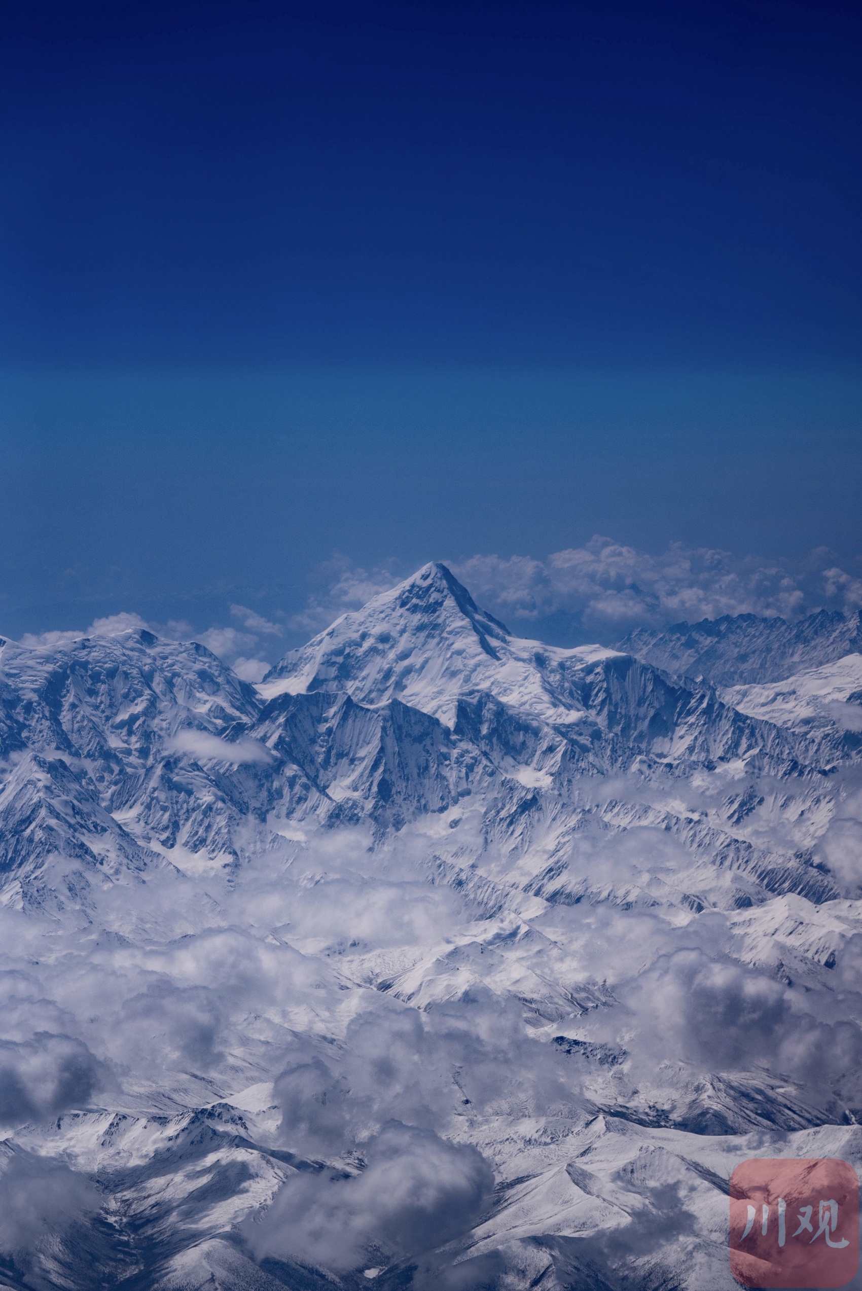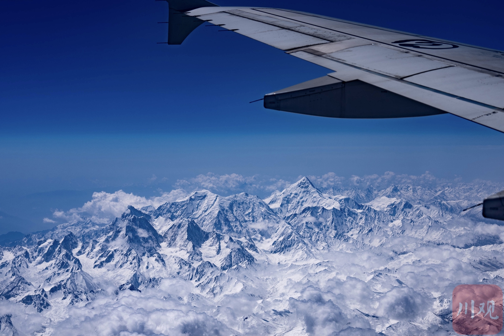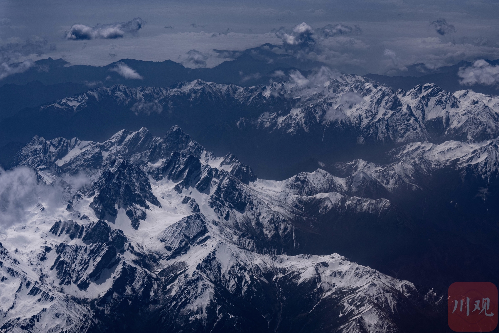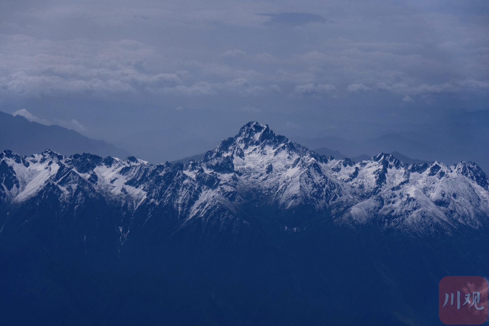 4月27日,记者在从成都飞往甘孜稻城的航班上,透过舷窗,目睹了壮丽的贡嘎群峰。贡嘎山主峰海拔7508.9米,是横断山脉的第一高峰,也是四川省第一高峰,因此也被称为“蜀山之王”。在蓝天的映衬下,贡嘎山雪峰耸立,白雪皑皑,宛如一幅天然的水墨画卷。