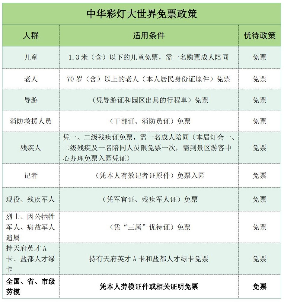 此外,1.3米(含)以下儿童,70岁(含)以上老人,导游,消防救援人员,残疾人,记者,现役、残疾军人,烈士、因公牺牲军人、病故军人遗属,持天府英才A卡、盐都人才绿卡,全国、省、市级劳模十大类人群,可享受园区免票政策。