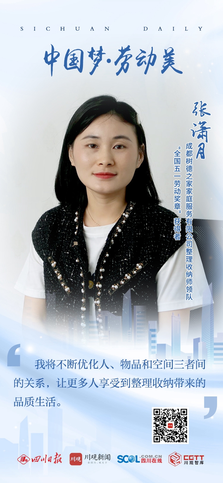 张潇月,2024年“全国五一劳动奖章”获得者,成都树德之家家庭服务有限公司整理收纳师领队。从业6年来,她始终坚持着对整理收纳工作的初心使命,服务时长超一千小时,先后参加成都市、四川省、全国整理收纳职业技能竞赛,曾获“四川省最美家政人”“四川家政整理收纳金盒子”等荣誉称号。