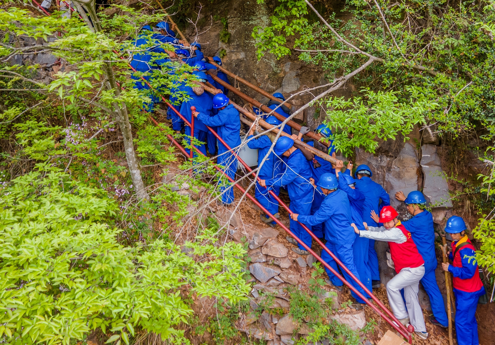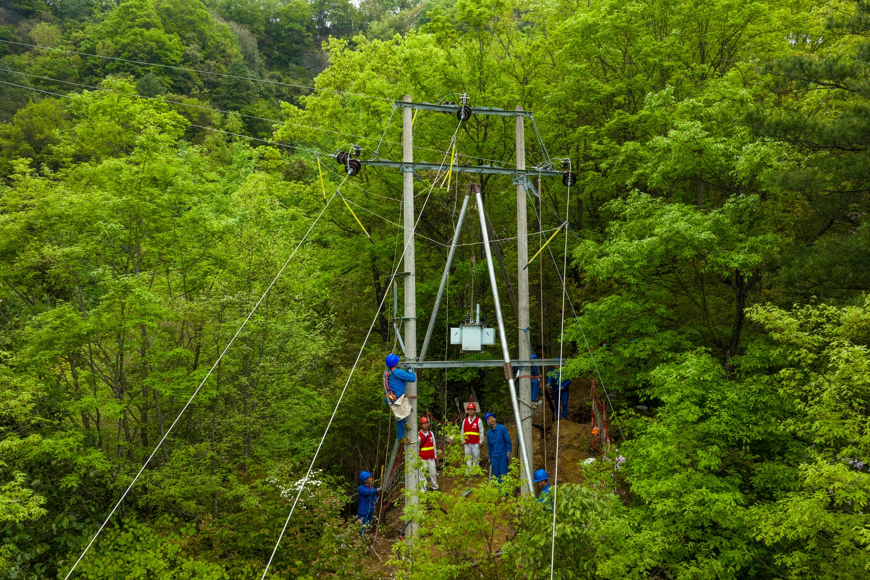 4月23日清晨7时30分,晨雾还未散去,四川巴中南江县光雾山镇槐树村落旗山社传来阵阵号子声。通往落旗山社的羊肠小道上,国网四川省电力公司巴中供电公司19名作业人员,沿着崎岖小路,铆足劲,抬着重达700斤的变压器向陡峭的山岩上爬去。一旁,23名后勤人员背着工器具及生活物资同步前行。
