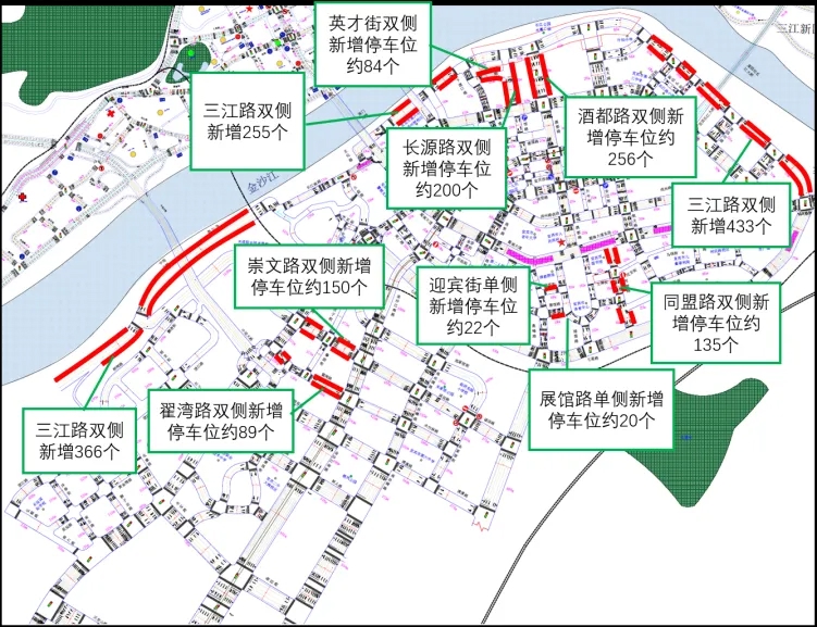 增设英才街(下渡口路—长源路)、长源路(英才街—长江南路西段)、酒都路(三江路—长江南路西段)、三江路(戎州桥—下渡口段、英才街—大溪口)、同盟路(七星路-文博路)、迎宾街、展馆路、崇文路(外江路-金沙江大道)、翟湾路(藤荫街—金沙江大道、碧竹山庄前路段)临时占道停车停车位。