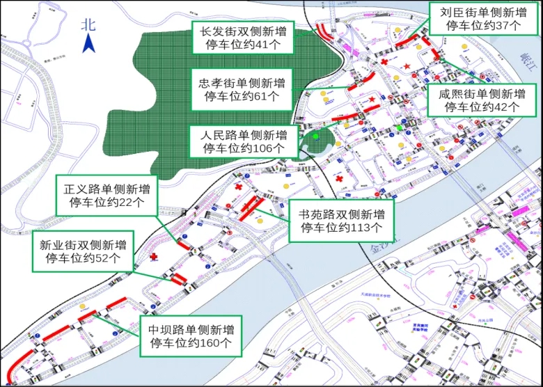 增设人民路(岳五里-水井街单侧,水井街-鲁家园单侧)、忠孝街(北操场-北大街)、书苑路(中坝桥-沿江路)、新业街(中坝路-翠柏路)、咸熙街(天主教堂-都长街)、长发街(老宜飞路口-岷江桥南桥头)、刘臣街(丝绸街-长春街)、中坝路(桑田路-大运学校)、正义路(前进路-中坝路)临时占道停车停车位。