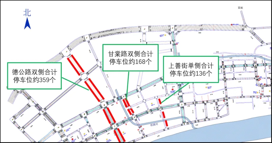 增设德公路(北滨路-宜南快速路)、甘堂路(正信路-昭德路)、上善街(北滨路-锦西路)临时占道停车停车位。