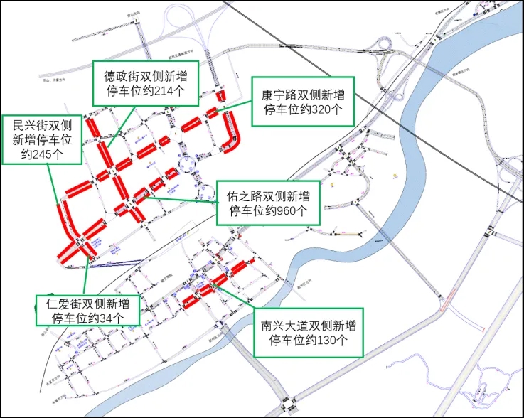 增设德政街(佑之路-金山路)、民兴街(佑之路-康宁路)、佑之路(坤泰路-康村街)、康宁路(德政街-康村街)、仁爱街(坤泰路-佑之路)、南兴大道(园门街-五友路)临时占道停车停车位。