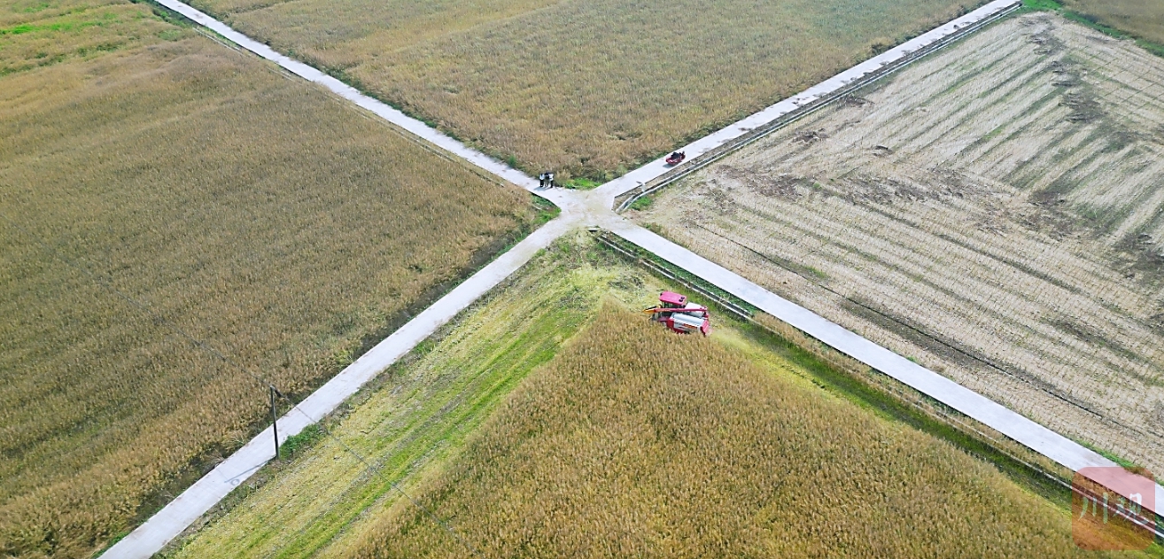 在仁寿越友种植专业合作社的600亩油菜种植基地,成片的油菜已经成熟,沉甸甸的油菜籽压弯了枝头。两台收割机在田间往来穿梭,伴随着隆隆的作业声,一排排油菜被卷入机器,自动脱粒之后,油菜果壳和油菜秆则被碾成碎片,抛撒还田,育肥地力,而收割好的油菜籽则被送往烘干中心进行烘干。