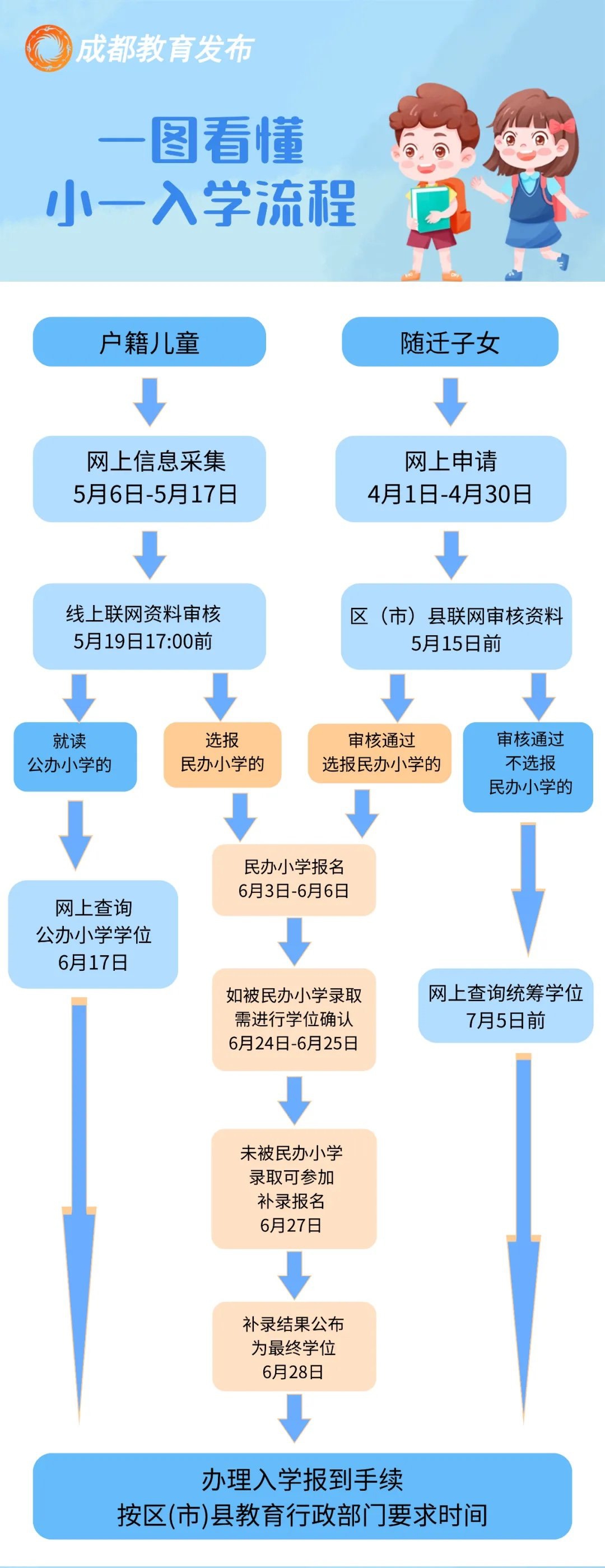 答:在成都市小一入学的所有适龄儿童均需进行网上信息采集,若准备选报民办小学,请于6月3日至6日登录“入学平台”进行民办小学网上报名。