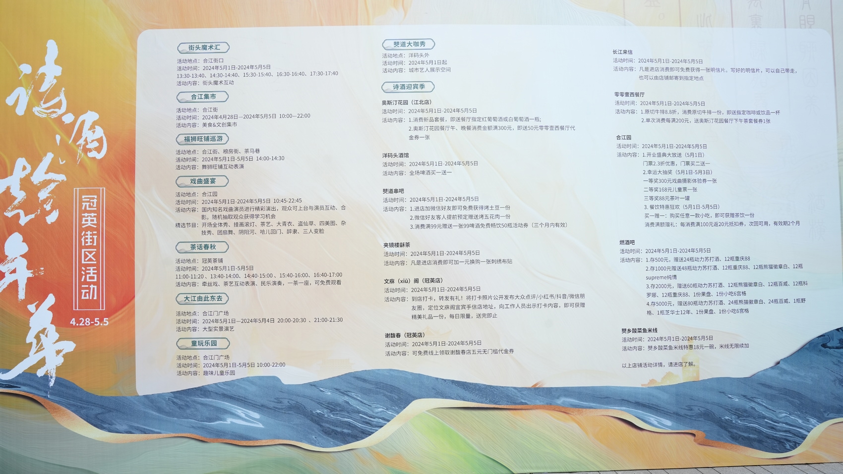 游客可以走进合江园店铺,品尝川菜、看戏剧表演,感受老四川的韵味;在文庥(xiū)阁逛逛琳琅满目的各式文创产品,挑选心仪好物;在长江来信复刻宜宾的通信记忆,体验“车马慢”的旧时光;可以沿着“五一”限时市集,闲逛在特色美食和文创手作摊位间,从街头吃到巷尾,将新鲜玩意收入囊中。