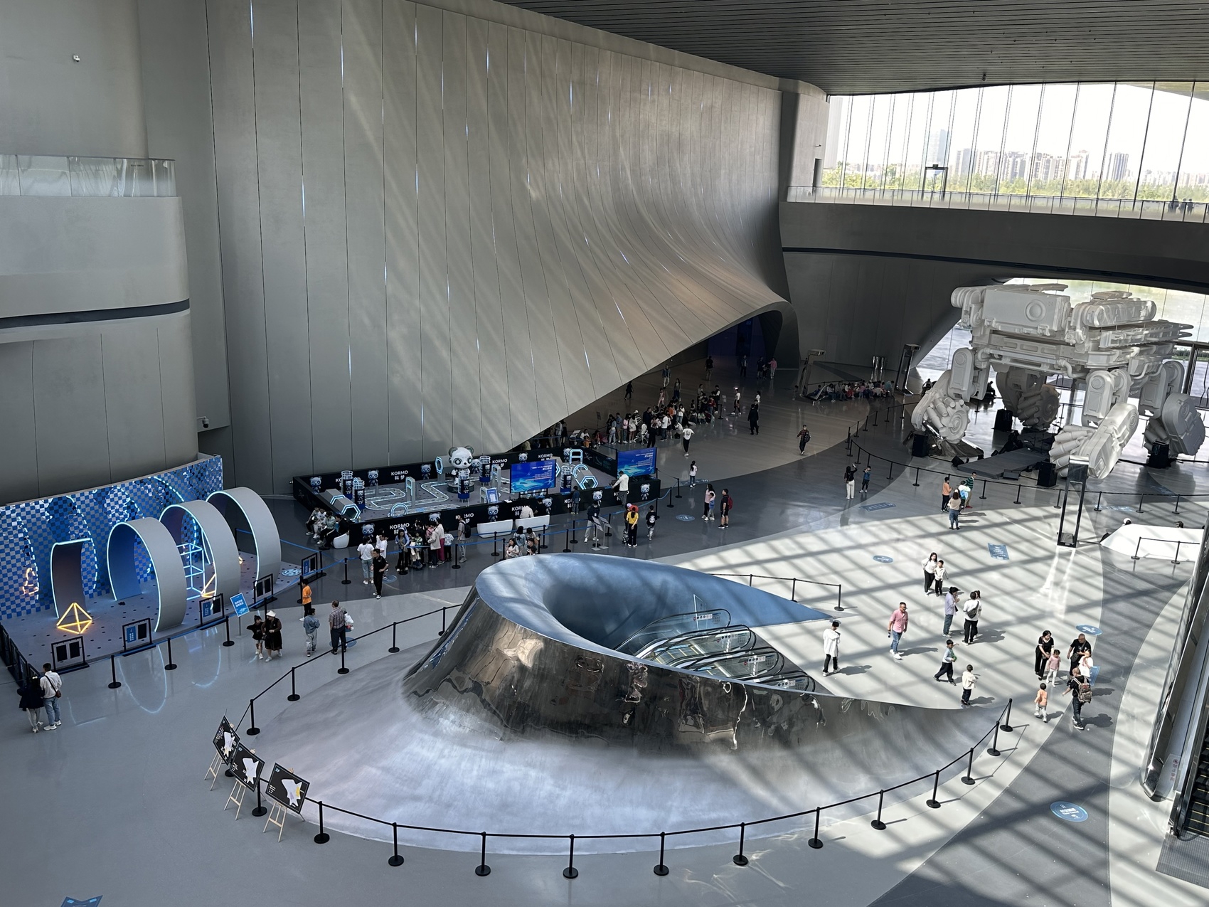 曾在电影《流浪地球》中有着精彩动人表现的机械狗“笨笨”,从电影中走进现实,化身约9米高的巨型雕塑,憨态可掬的形象让游客们忍不住拍照打卡。主办方通过精心设计多种色系、色温变换的光源,利用投影技术照射机器狗“笨笨”装置,带来了一场“笨笨”模型变装秀。“我和孩子都喜欢电影中的‘笨笨’,在成都科幻馆看到实物感觉很震撼!”专门带孩子来游玩的市民刘女士表示,“成都科幻馆面积很大、主题活动非常丰富,小朋友看到了不少科幻作品。这一趟不虚此行。”