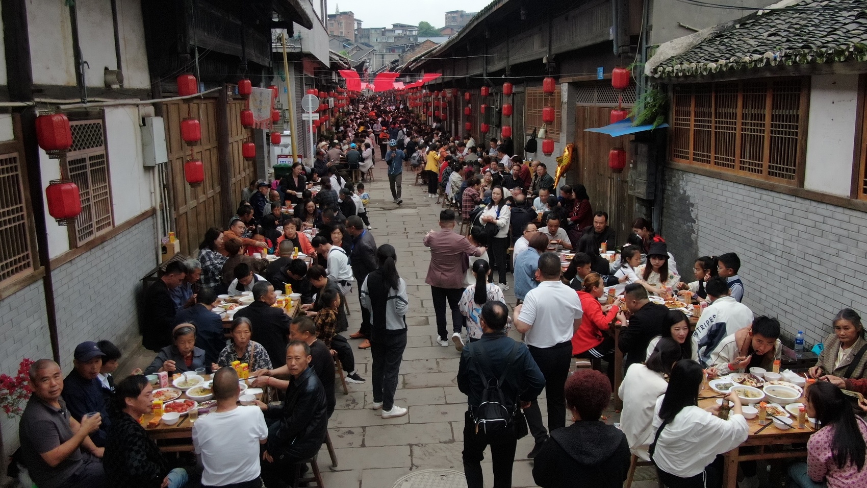 “干杯!”在古镇的一个长500百米巷道上,100多个四方桌整齐摆放,饥肠辘辘的游人围坐一桌大快朵颐,喝上一口地道的农家粮食酒,夹上一块回锅肉,心旷神怡,回味无穷。