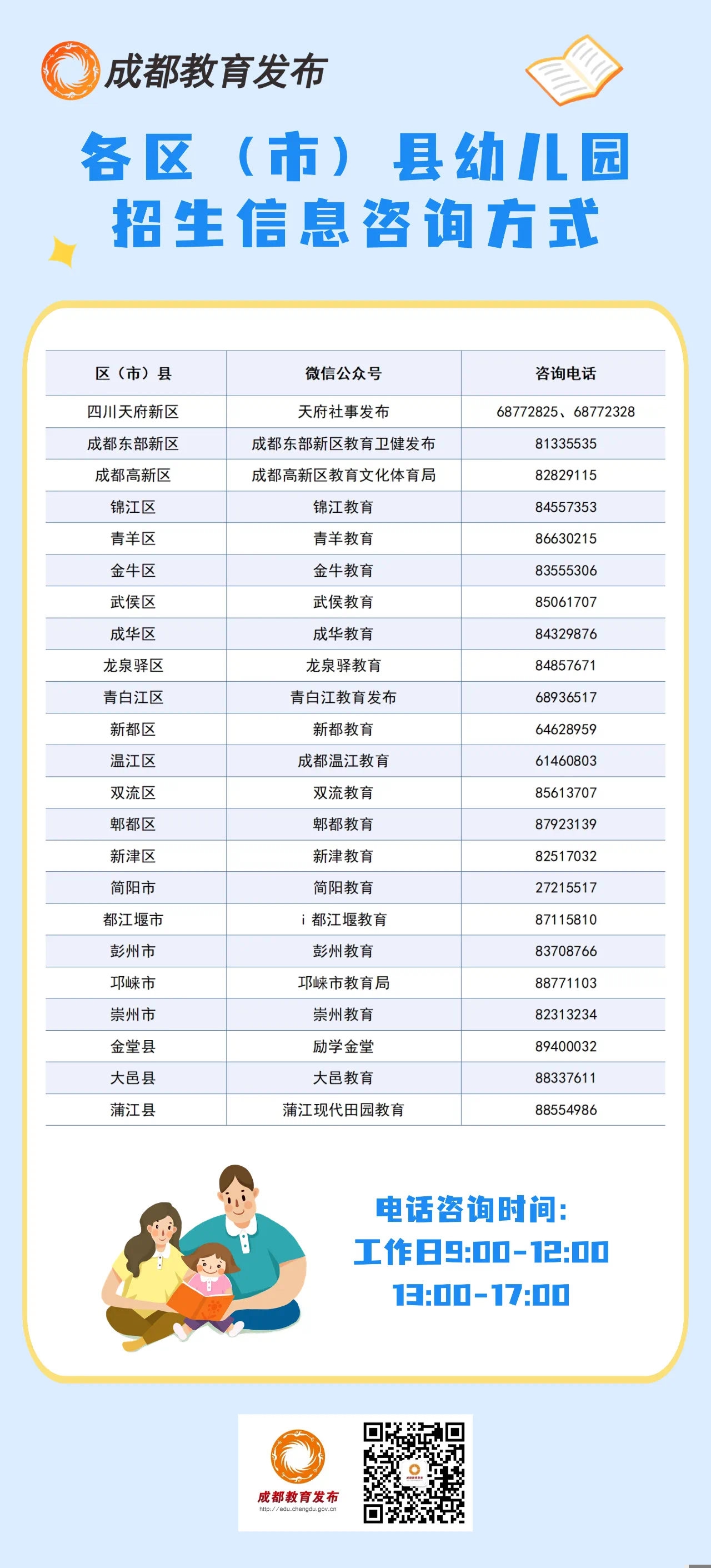答:家长可通过成都市教育局及各区(市)县教育行政部门官方微信公众号、网站查询今年招生入园相关政策要求,了解报名时间、报名条件、报名流程等信息。如查询后仍有问题需要咨询,家长可拨打各区(市)县教育行政部门招生咨询电话进行咨询。