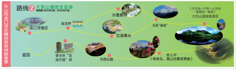 2.大瓦山湿地生态游:金口河城区——水墨顺河(花溪曙光)——凤凰“睡佛”——大瓦山湿地旅游区(大天池——干池——小天池——高梁池——鱼池)——鹿儿坪(转转花基地)——乐西公路——蓑衣岭“蓝褛开疆”碑——返回。