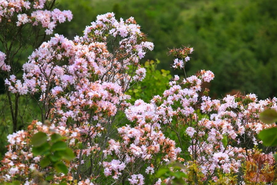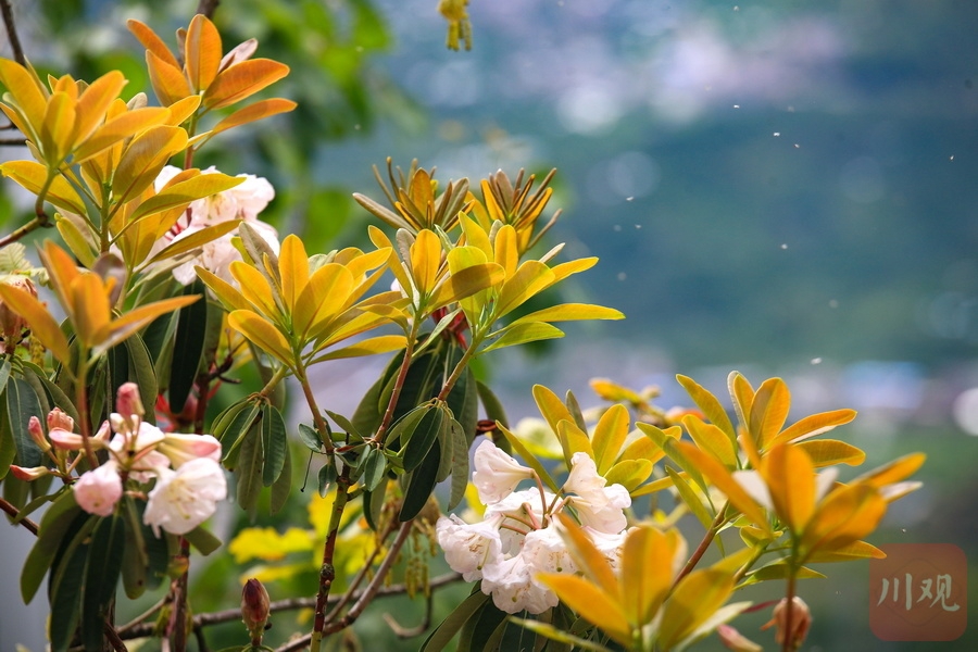 红色、粉色、白色……5月14日,在汉源县清溪镇永安村海拔两千多米的山间,各色野生杜鹃花争相斗艳,不远处,风力发电站的“大风车”高耸入云,白色的叶片在阳光下熠熠生辉,与色彩斑斓的杜鹃花一道勾勒出“宫崎骏的通话世界”,讲述着现代科技融入自然的故事。