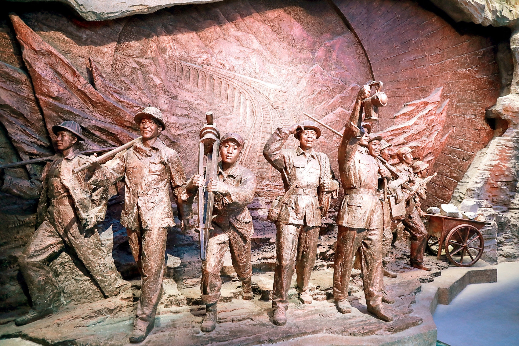 跟随杨楠前行,一幅“铁军鏖战成昆线”大型多维融合艺术演绎场景就生动再现了当时艰苦的作业环境。从四川盆地到云贵高原,穿越有“地质博物馆”之称的复杂山区,结合人物雕塑、多媒体、实物等多重手段,集中展示爆破、运渣、打钻、铺轨等工作内容。