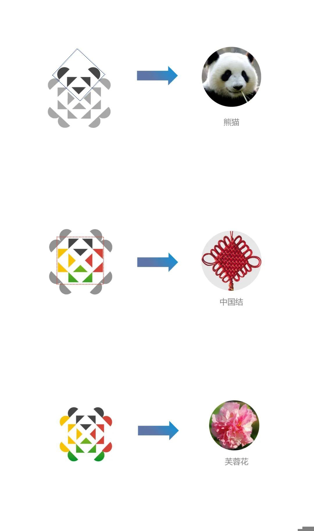“会徽的构图参考了中国结的形状,这种古老的手工编织工艺品简洁而优美,象征着团结、繁荣和幸运,它能变化出多种形态,仿佛绳结编成的魔方,非常令我着迷。”费尔利说,“图案中的半圆模拟大熊猫的耳朵,同时也可视为几何形态的芙蓉花瓣。会徽上下左右四个对称部分中,每一个都‘藏’着大熊猫的面部特征。”