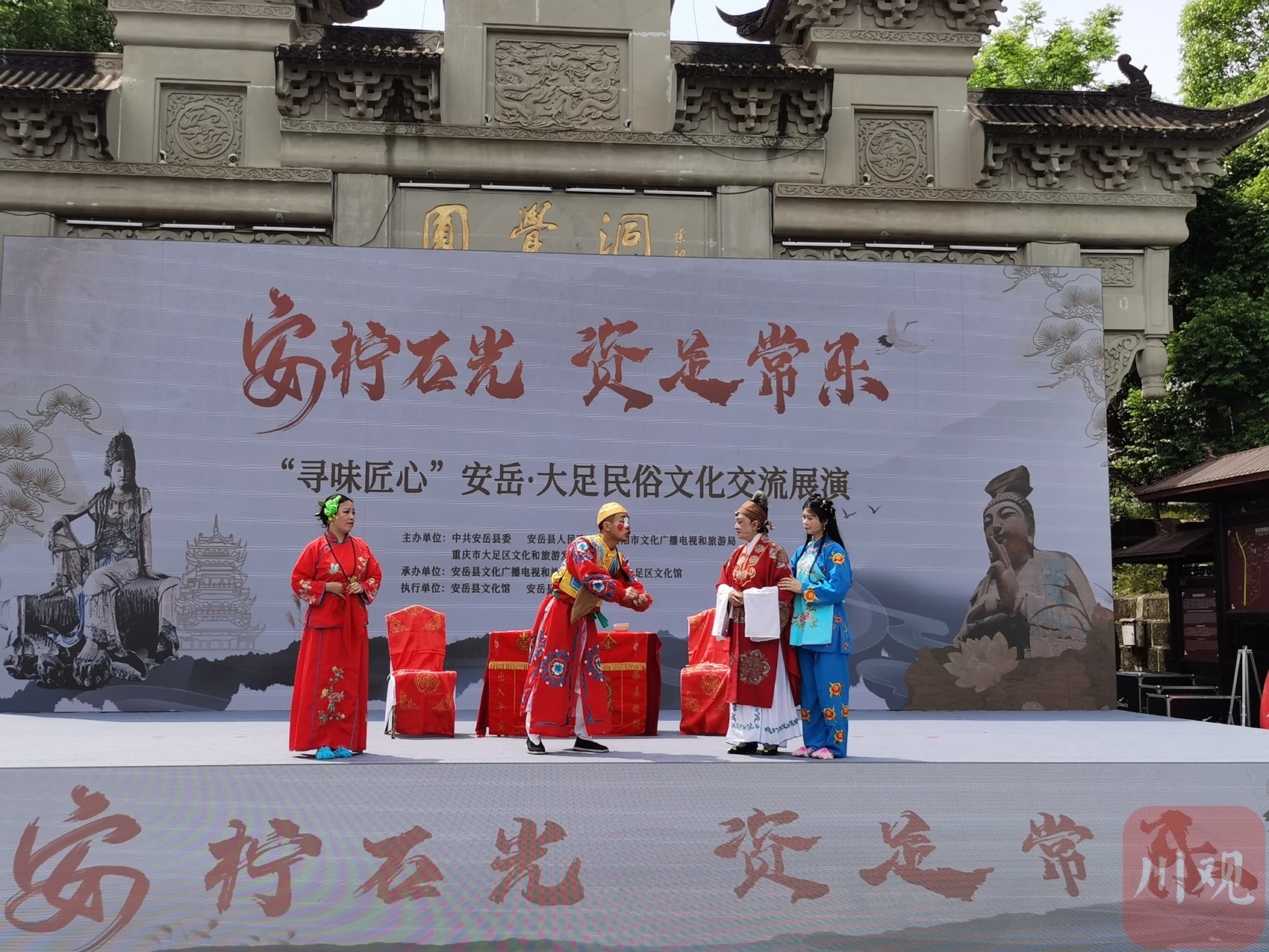 与此同时,活动现场,观众还欣赏到了精彩的“寻味匠心”安岳·大足民俗文化交流展演。龙狮表演、戏剧小品、非遗绝活等丰富多彩的节目让观众大饱眼福、耳福,也近距离感受到两地各具特色的民俗文化。