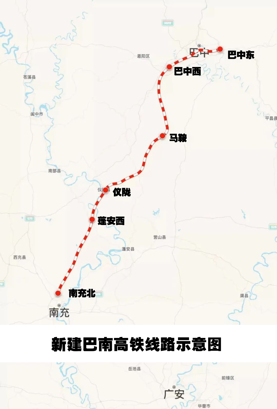 巴南高铁起自新建巴中东站向西经巴中市经开区、巴州区、恩阳区,南充市仪陇县、南部县、蓬安县、顺庆区,接入南充北站,线路全长约148公里,正线设计时速250公里,全线共设车站6座,其中南充北站为接轨站,蓬安西站、仪陇站、马鞍站、巴中西站、巴中东站为新建中间站。