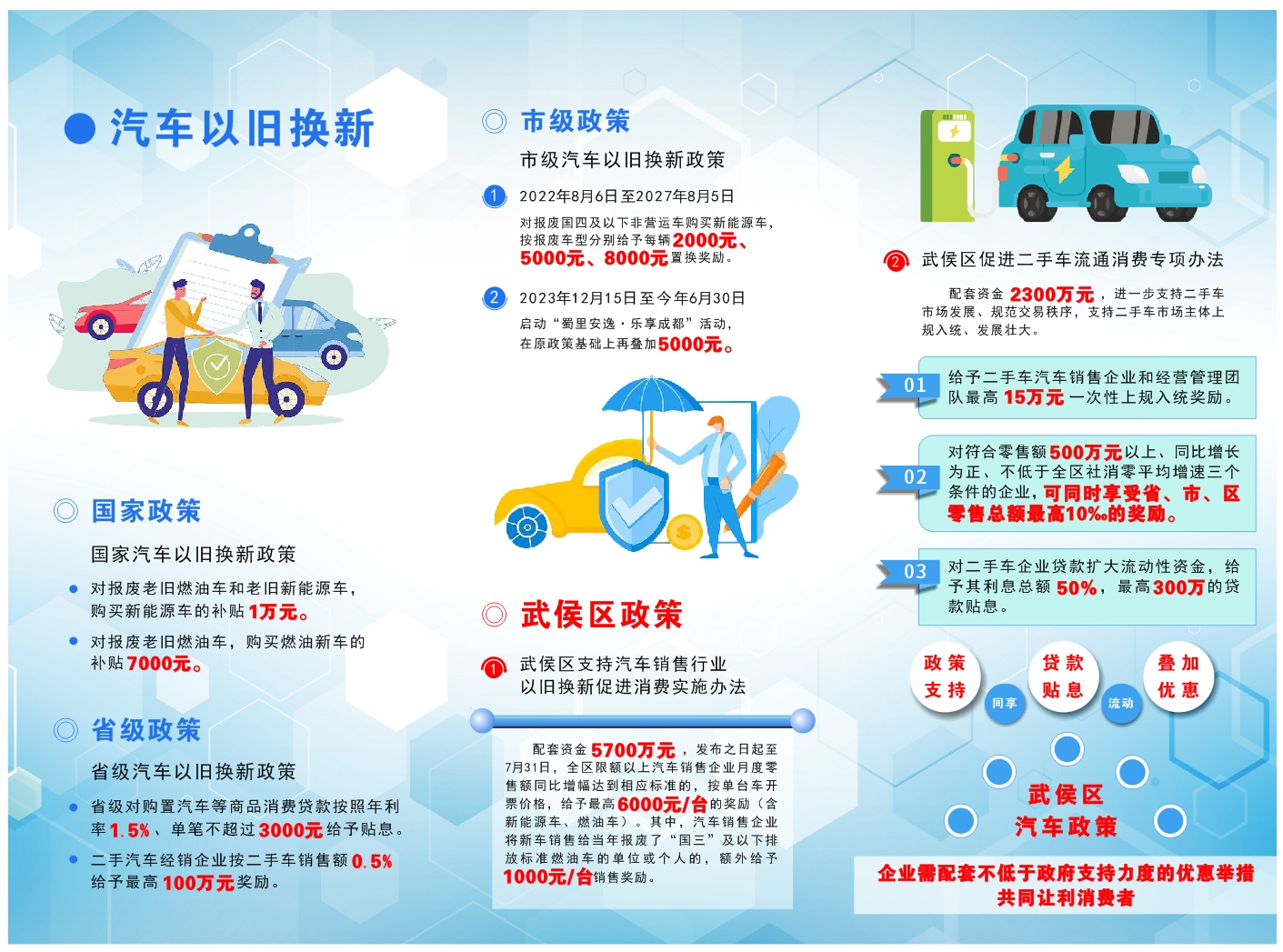 以汽车消费为例,综合国家、省、市、区政策措施,个人消费者报废旧车购买新能源车可享受“国家补贴10000元+市级汽车消费券+武侯区车企3000-7000元”以上让利;报废旧车购买燃油车可享受“国家补贴7000元+市级汽车消费券+武侯区车企2500-6500元”以上让利。个人消费者购买新能源车可享受“市级汽车消费券+武侯区车企2000-6000元”以上让利;购买燃油车可享受“市级汽车消费券+武侯区车企1500-5500元”以上让利。