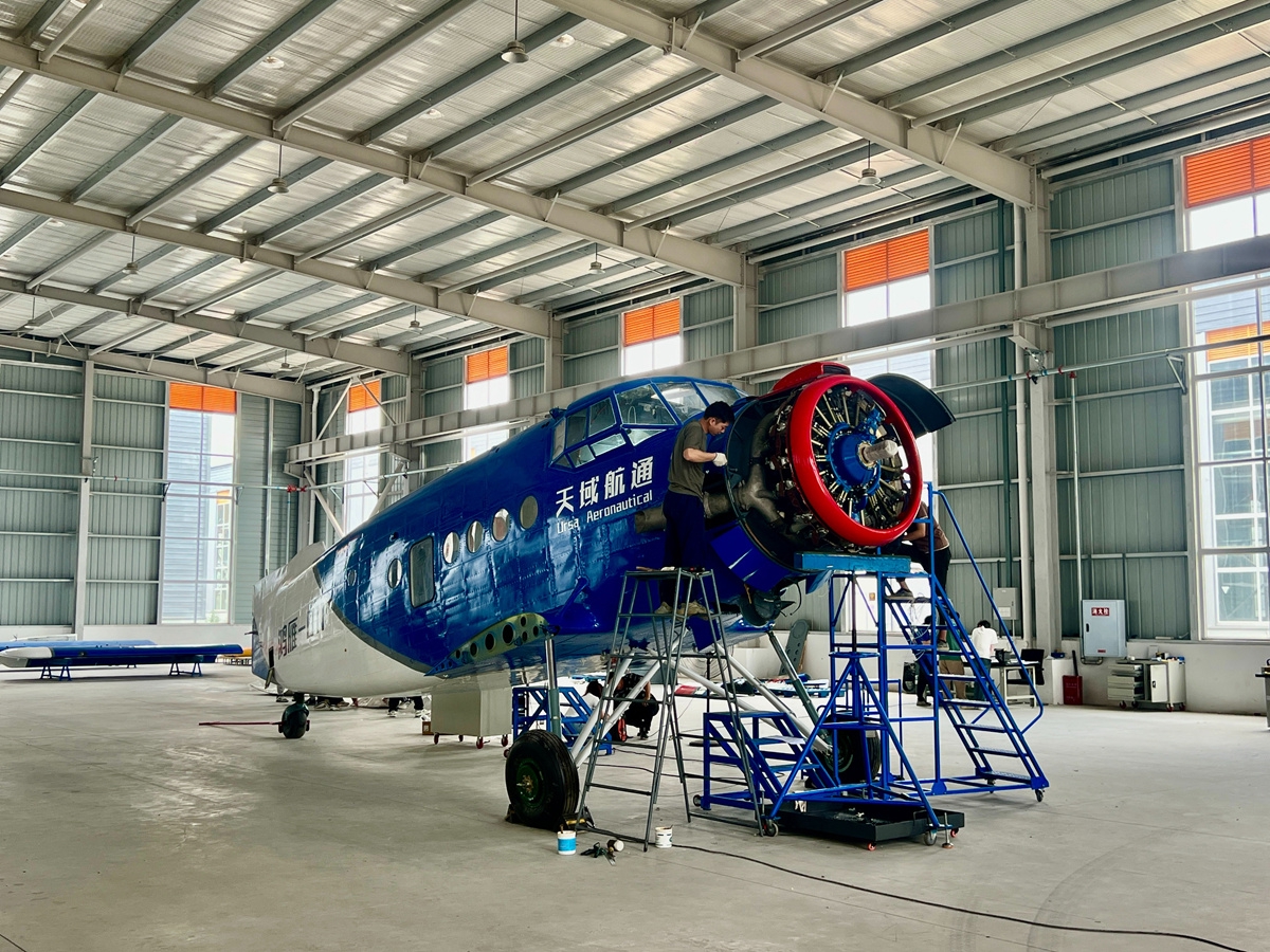 一架载货量1.9吨、单次飞行距离1500公里的中大型无人机正在天域通航车间内进行组装。陈丽霏 摄