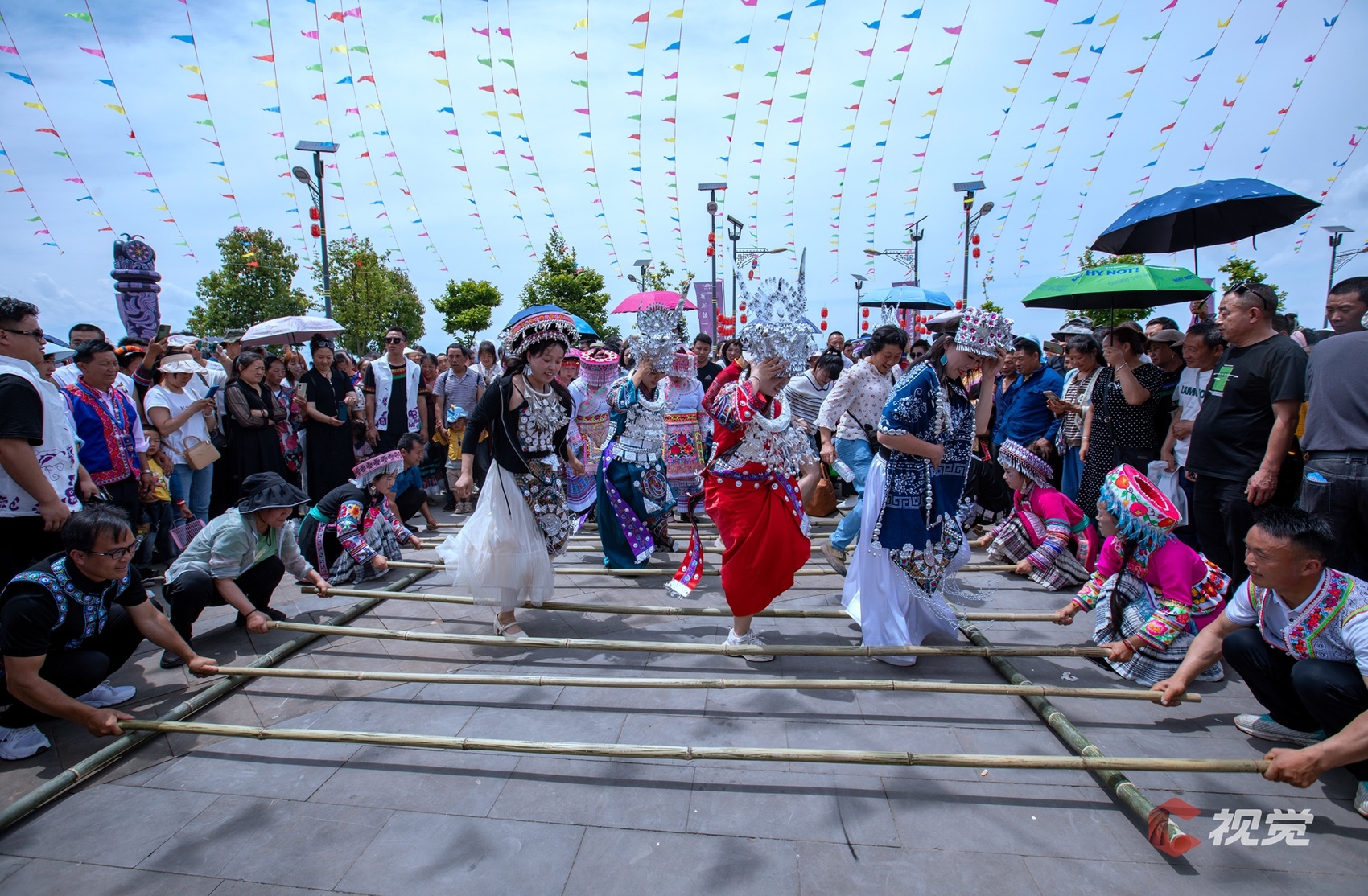 “阿妹站在寨门口,手捧一碗拦门酒,贵客你若进寨来,先喝一碗拦门酒……”在寨子门口,身穿节日盛装的苗族姑娘已等候在道路两旁,踏着悠扬的芦笙调,唱着动听的祝酒歌,为四方宾客献上苗家米酒。花杆是苗族谋求福祉的神,花竹是苗族繁荣兴旺的根,活动在传统的“祭花杆”仪式中拉开序幕。精彩的文艺表演陆续搬上舞台,苗族服饰走秀更是展现出民族艺术的独特风采。舞台周围,村民们身着苗族、彝族服饰,五彩斑斓、绚丽多姿。微风拂过,苗族女性帽檐上镶着的流苏银饰发出风铃般的清脆响声,动听悦耳。