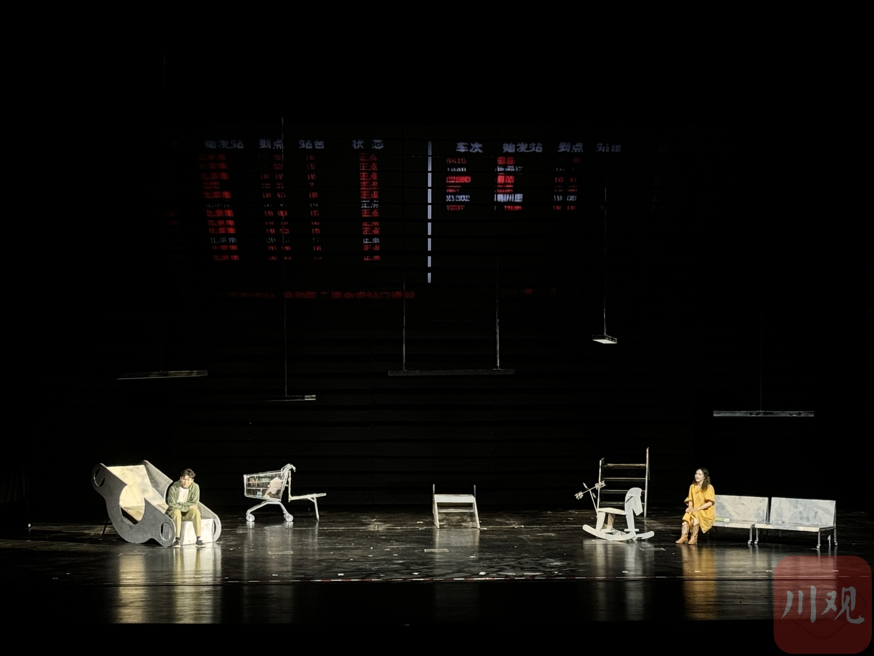 话剧运用多媒体大屏和丰富的音效,搭建出色彩鲜明、人物突出的舞台效果,并加入两段音乐场面,包括一段音乐舞蹈,让话剧层次丰富、场景鲜明。结尾,两个人决定开启新生活,从站台上离开,在快节奏的热闹场面中完成谢幕,给观众留下一个空荡荡的站台和无限的想象空间。