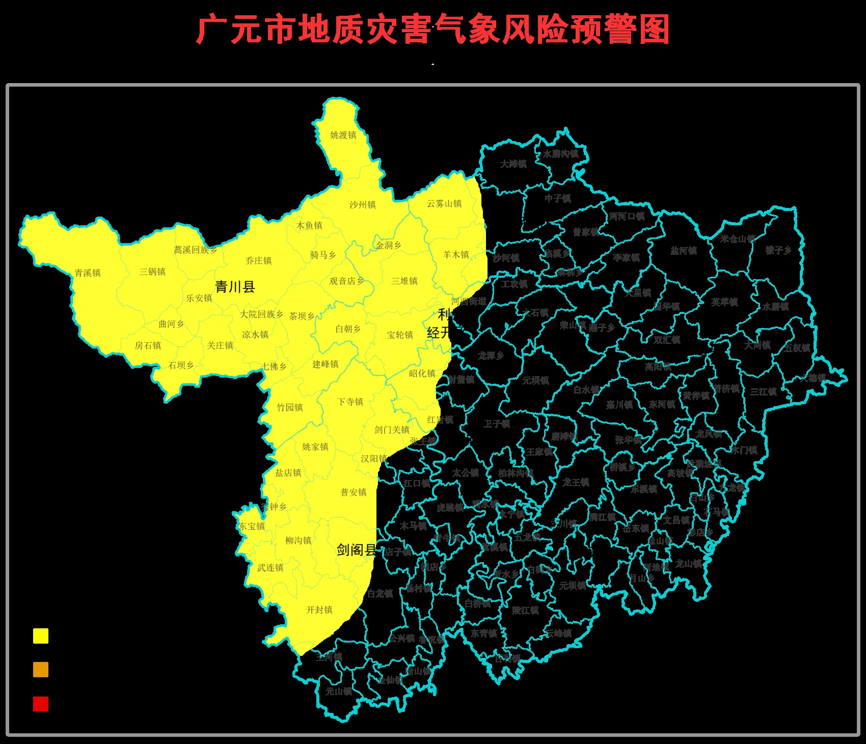 未来24小时,广元市地质灾害气象风险黄色预警范围。广元市地质灾害指挥部办公室供图