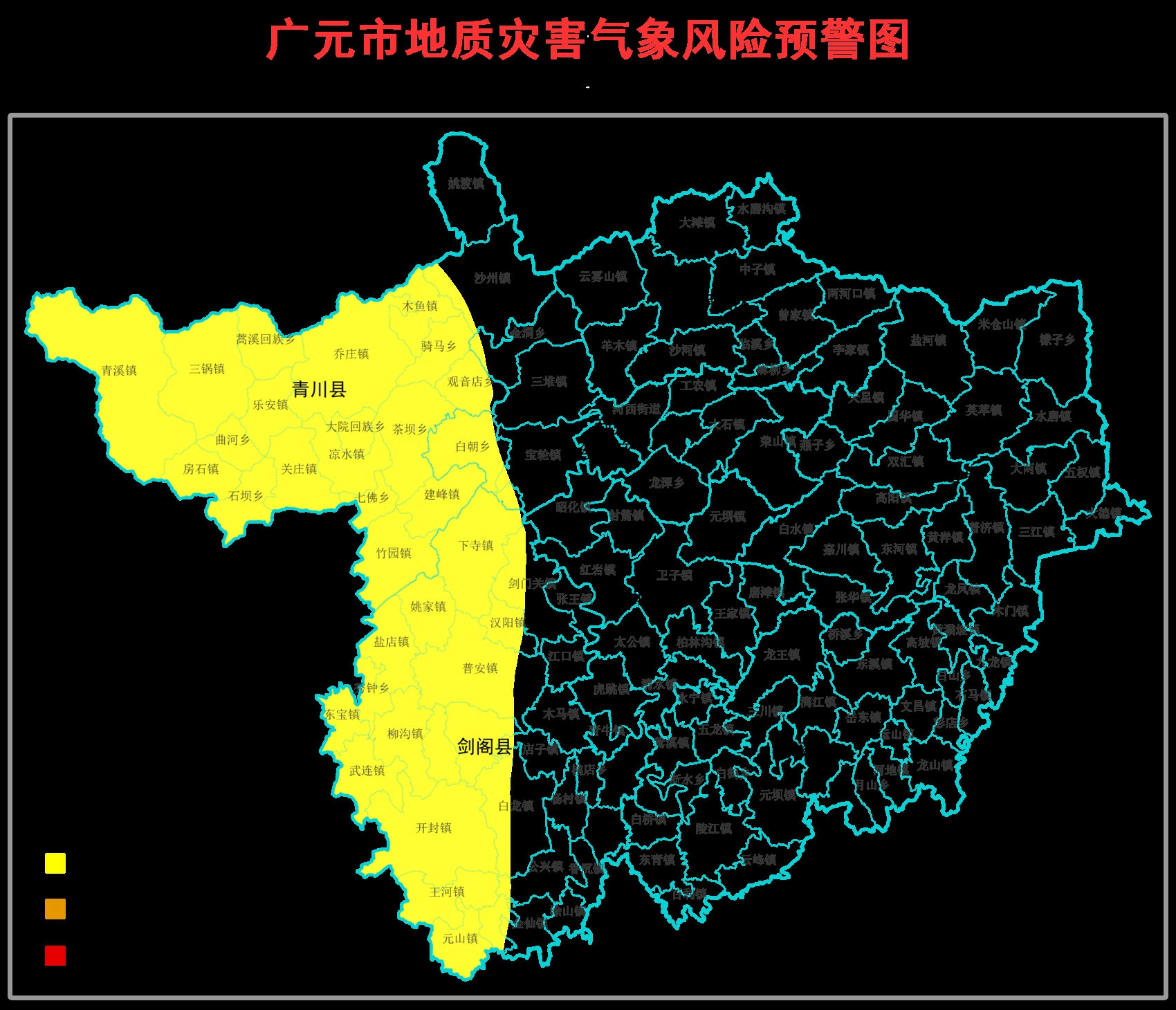 广元市地质灾害指挥部办公室同步发布地质灾害气象风险黄色预警,5月27日20时至28日20时,广元市3个县(区)42个乡镇发生地质灾害的风险较高(黄色预警),具体为:青川县乔庄镇、青溪镇、房石镇、关庄镇、凉水镇、竹园镇、木鱼镇、沙州镇、三锅镇、建峰镇、乐安镇、茶坝乡、蒿溪回族乡、曲河乡、石坝乡、大院回族乡、七佛乡、骑马乡、观音店乡,剑阁县普安镇、龙源镇、盐店镇、柳沟镇、武连镇、东宝镇、开封镇、元山镇、演圣镇、王河镇、公兴镇、金仙镇、白龙镇、剑门关镇、汉阳镇、下寺镇、店子镇、姚家镇、义兴镇、秀钟乡,利州区宝轮镇、白朝乡、金洞乡等。