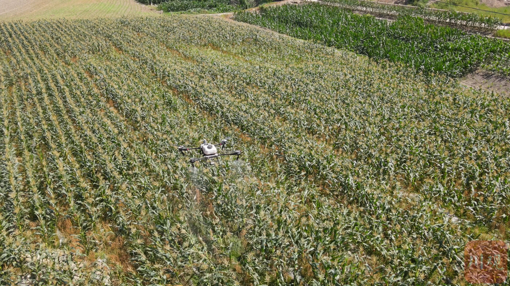 在玉米地上空,一架农用植保无人机在技术人员的操作下平稳飞行,将生物农药药剂均匀喷洒到田地里,1个小时左右,就完成了最后150余亩玉米的田间管理。