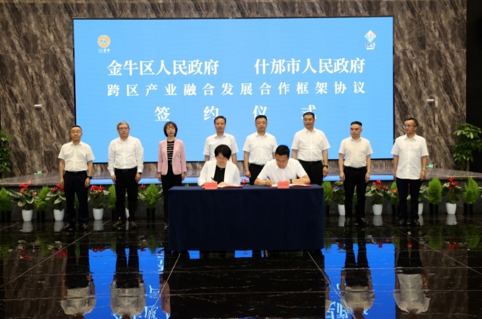 金牛区经信局、商务局、投促局分别与什邡市经科局、商务经合局、产促中心签署《共同推动金牛区什邡市工业经济融合发展协议》《商贸领域合作协议》《金牛区什邡市联合招商引资合作协议》,金牛区、什邡市共同签署《跨区产业融合发展合作框架协议》。
