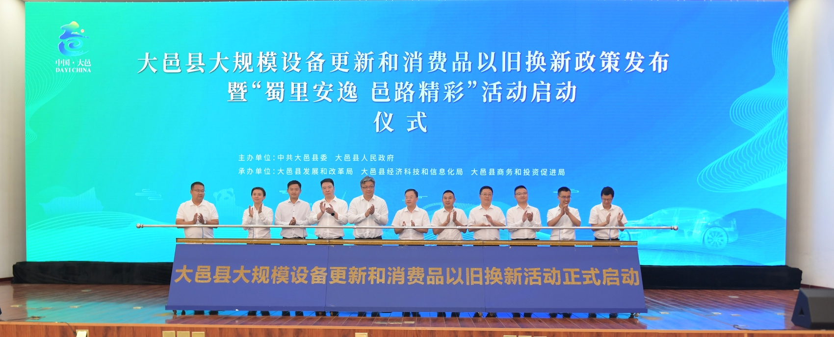 5月31日,成都市大邑县举行大规模设备更新和消费品以旧换新政策发布暨“蜀里安逸·邑路精彩”活动,发布并解读大邑县大规模设备更新和消费品以旧换新政策。