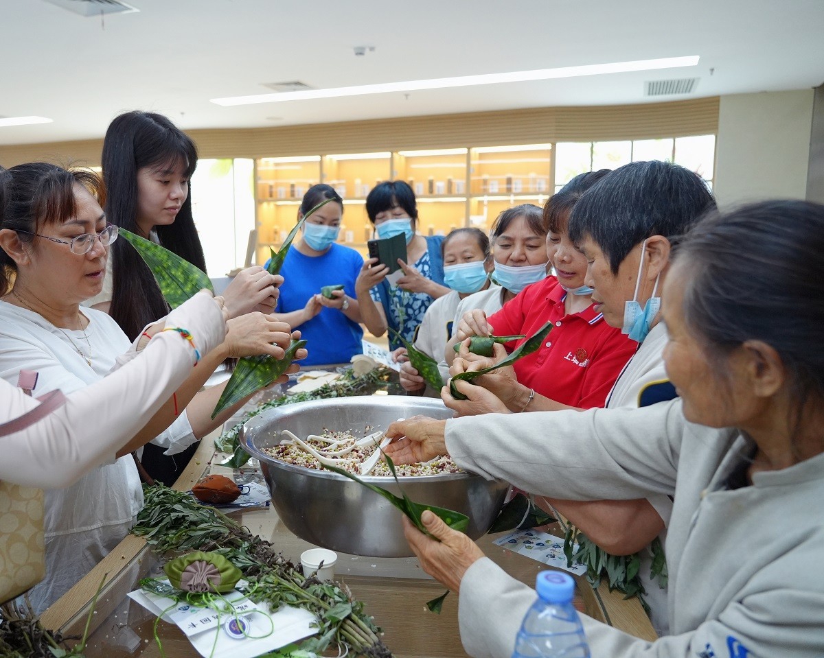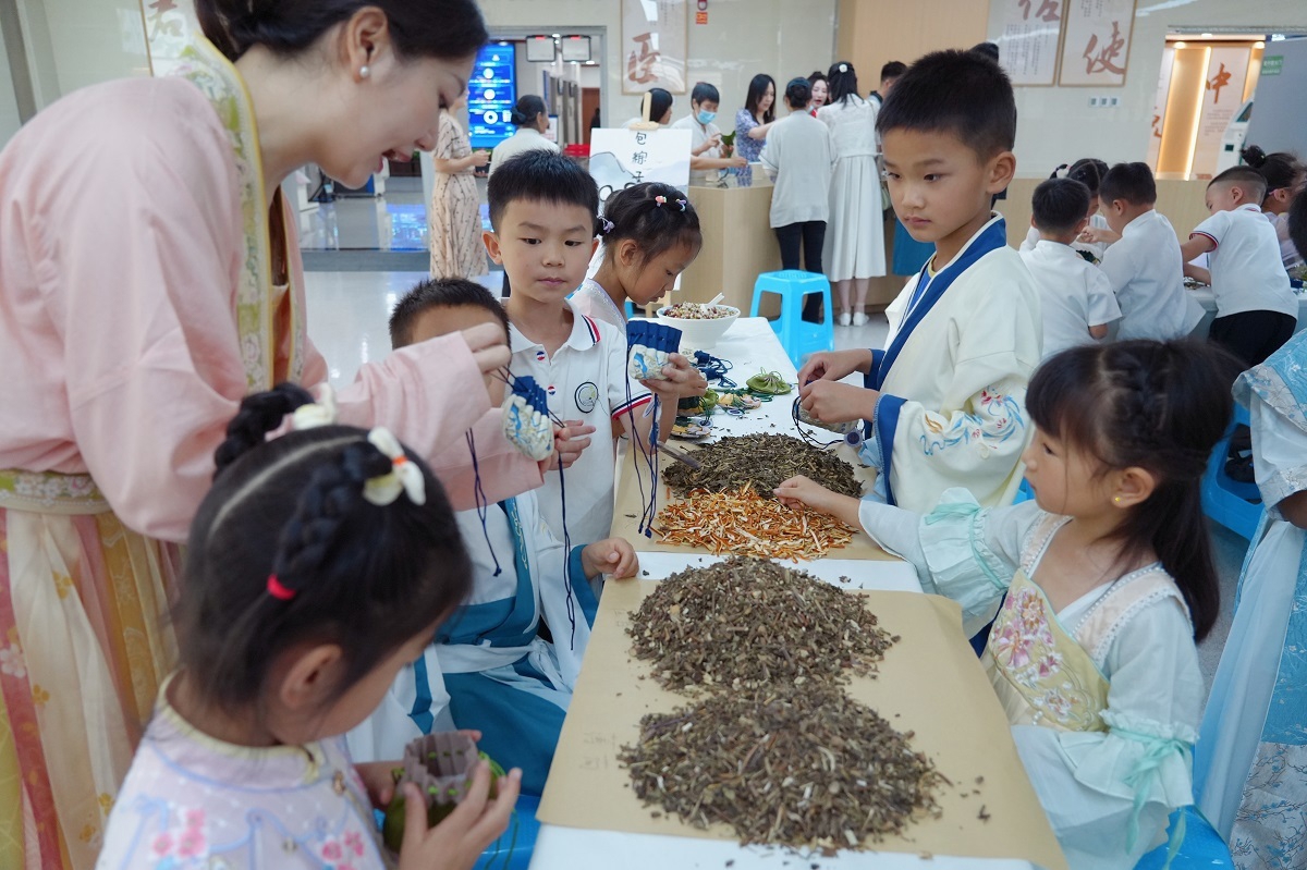 “这是藿香,这是佩兰……”中药配方驱蚊香囊制作受到了大家的热烈欢迎,在医院药师的指导下,大家认真地将藿香、佩兰、陈皮、薄荷等多味中药放入香囊袋中,系好绳子。
