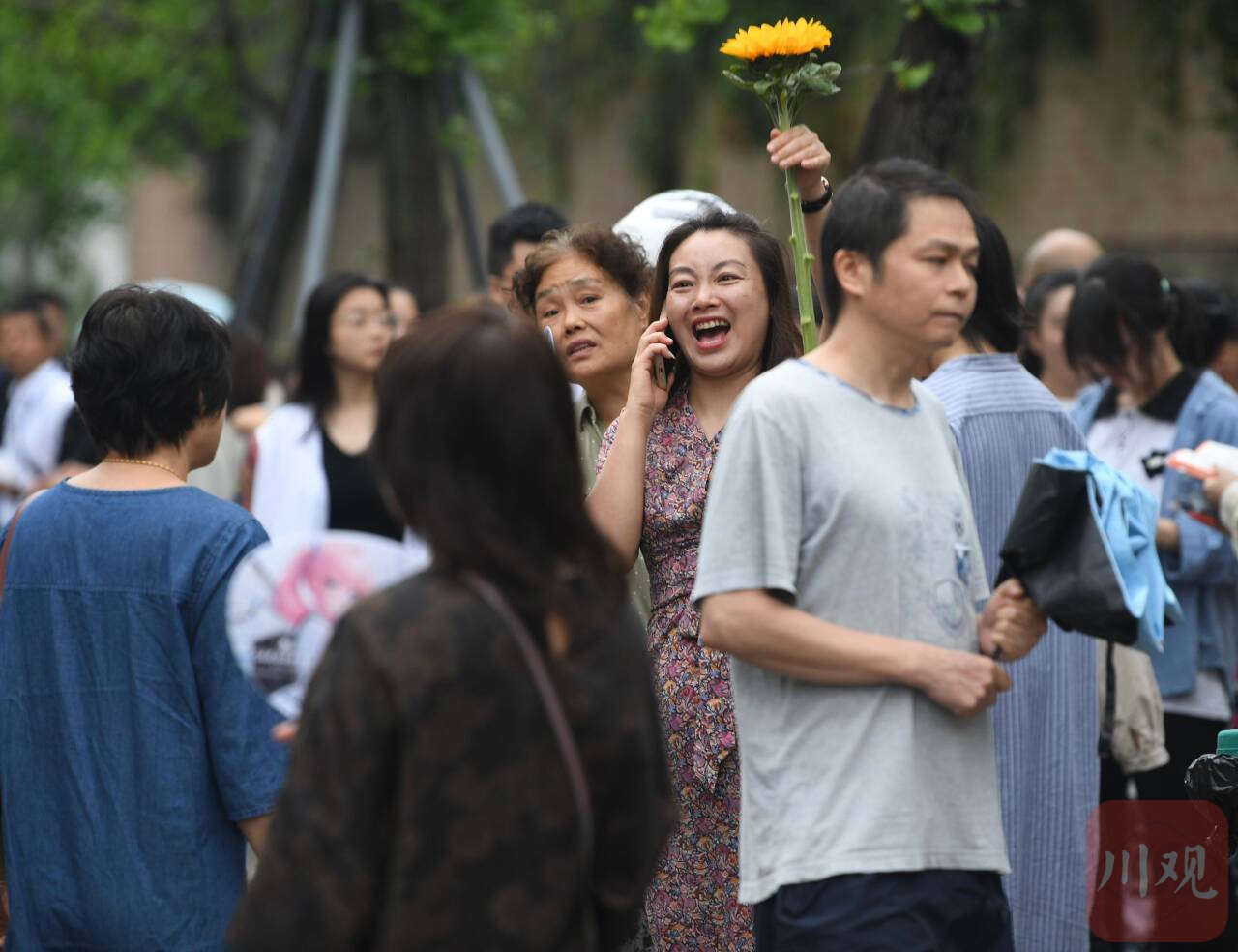 在成都市树德协进中学考点附近,除了穿旗袍的妈妈们,还有不少怀抱向日葵送考的家长,准备等孩子一出考场就送上“一举夺魁”的祝福。