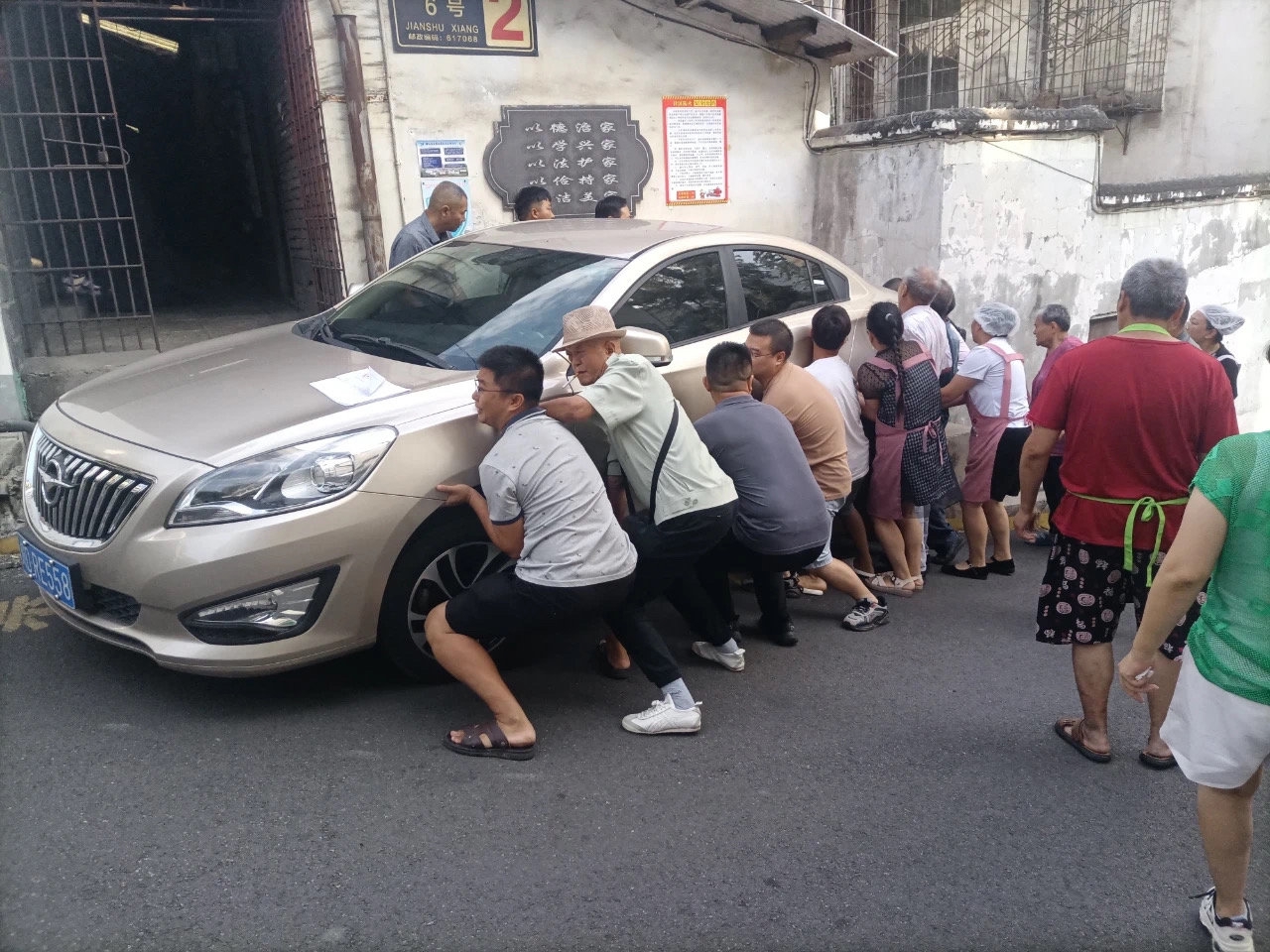 众人合力抬车。(受访者供图)